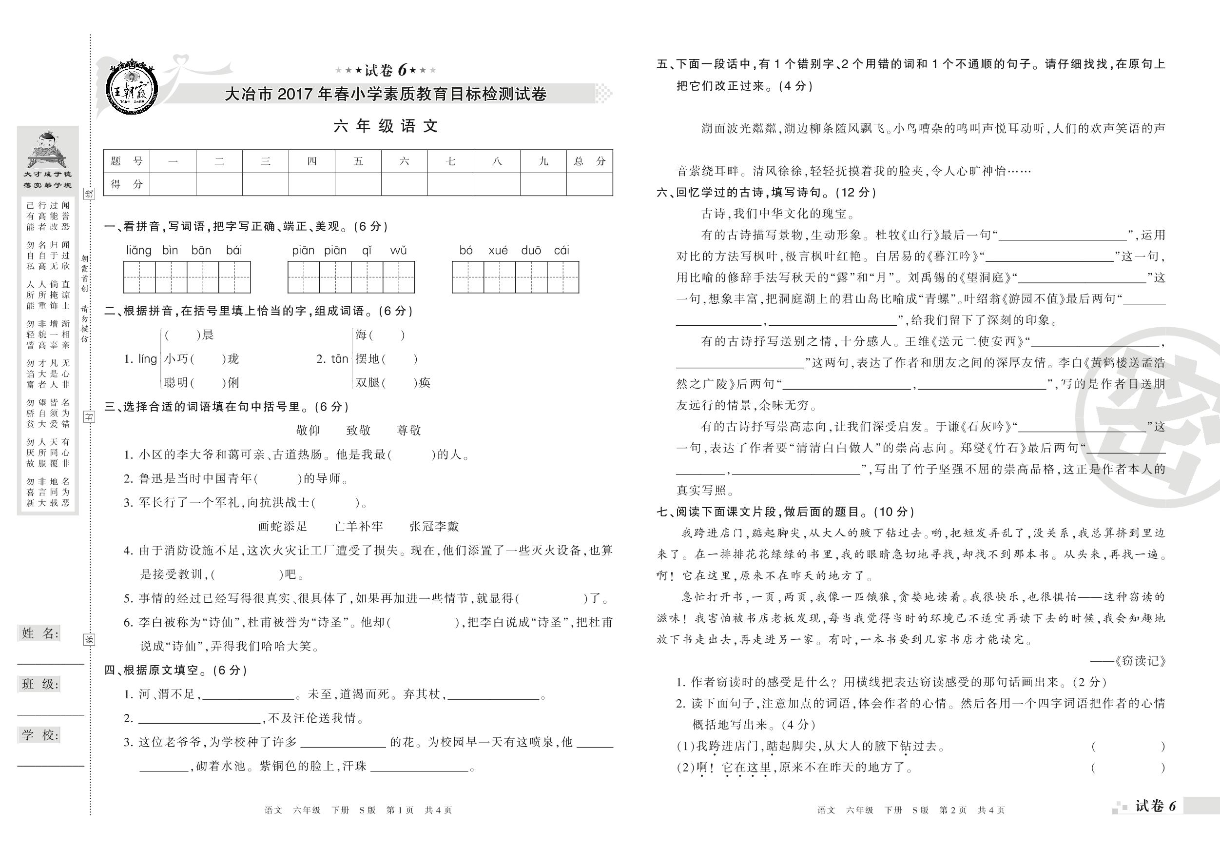 2016-2017学年第二学期大冶市六年级语文试卷(S版)【6】