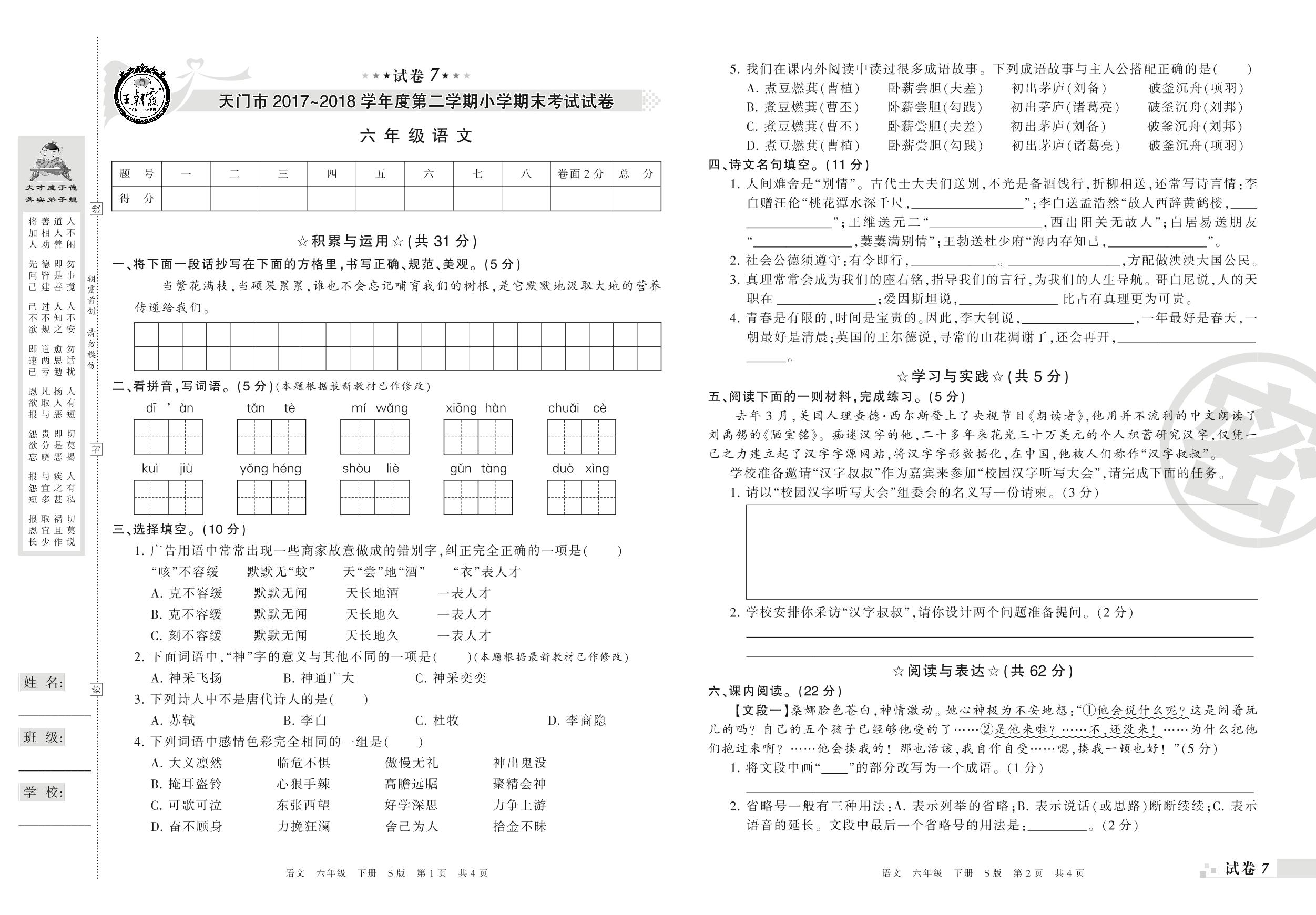 2017-2018学年第二学期天门市六年级语文试卷(S版)【7】