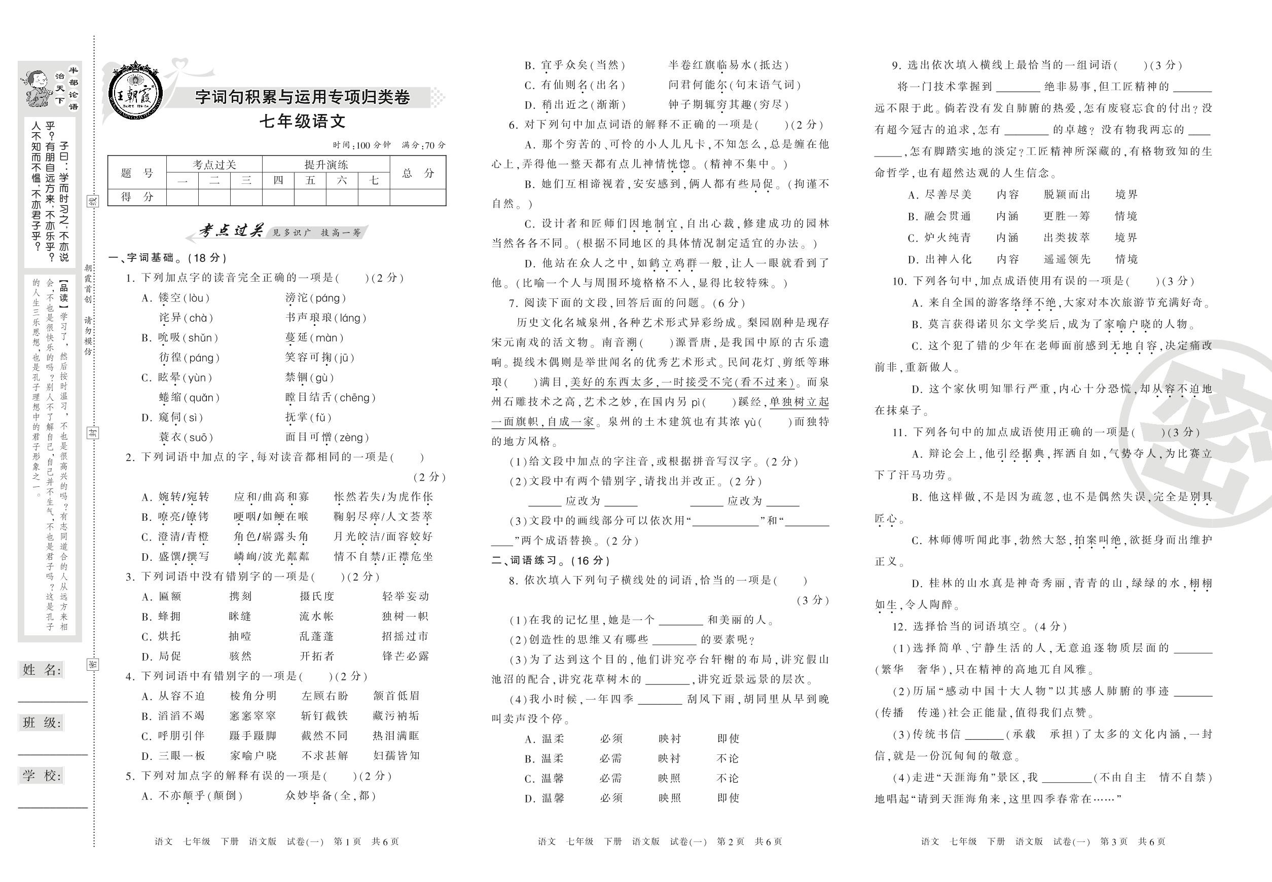 七年级语文语文版下册专项卷