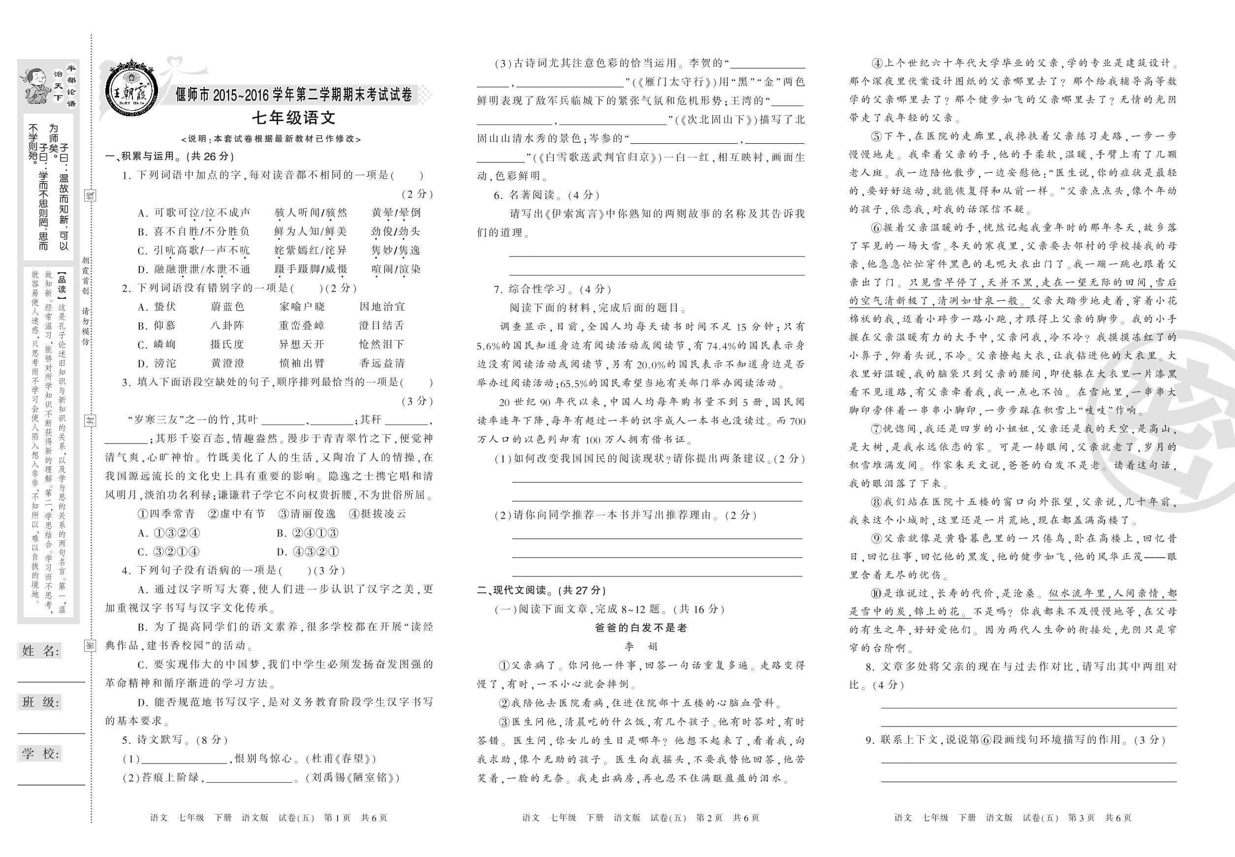 2015-2016学年第二学期偃师市七年级语文试卷(语文版)【5】