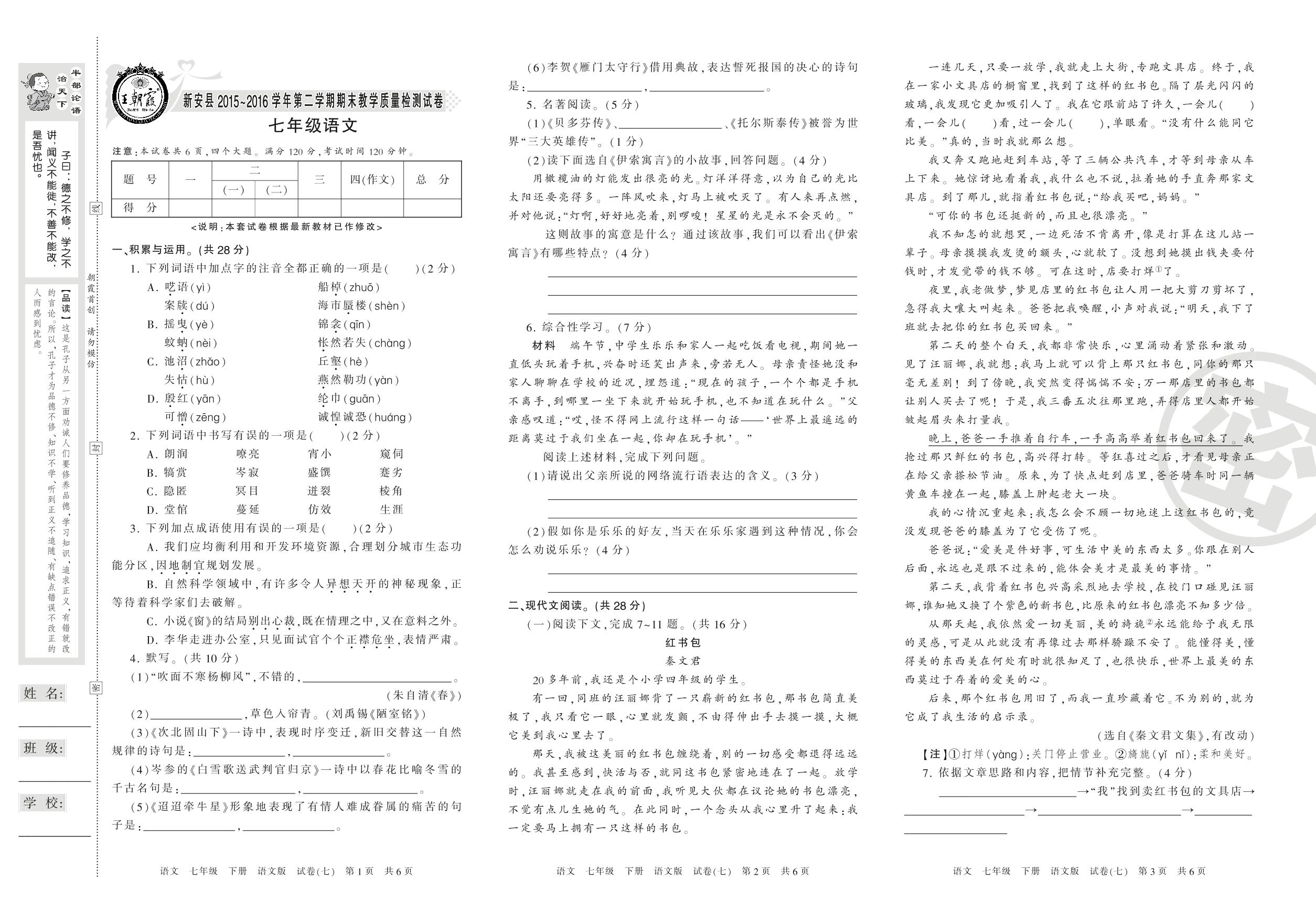 2015-2016学年第二学期洛阳市新安县七年级语文试卷(语文版)【7】