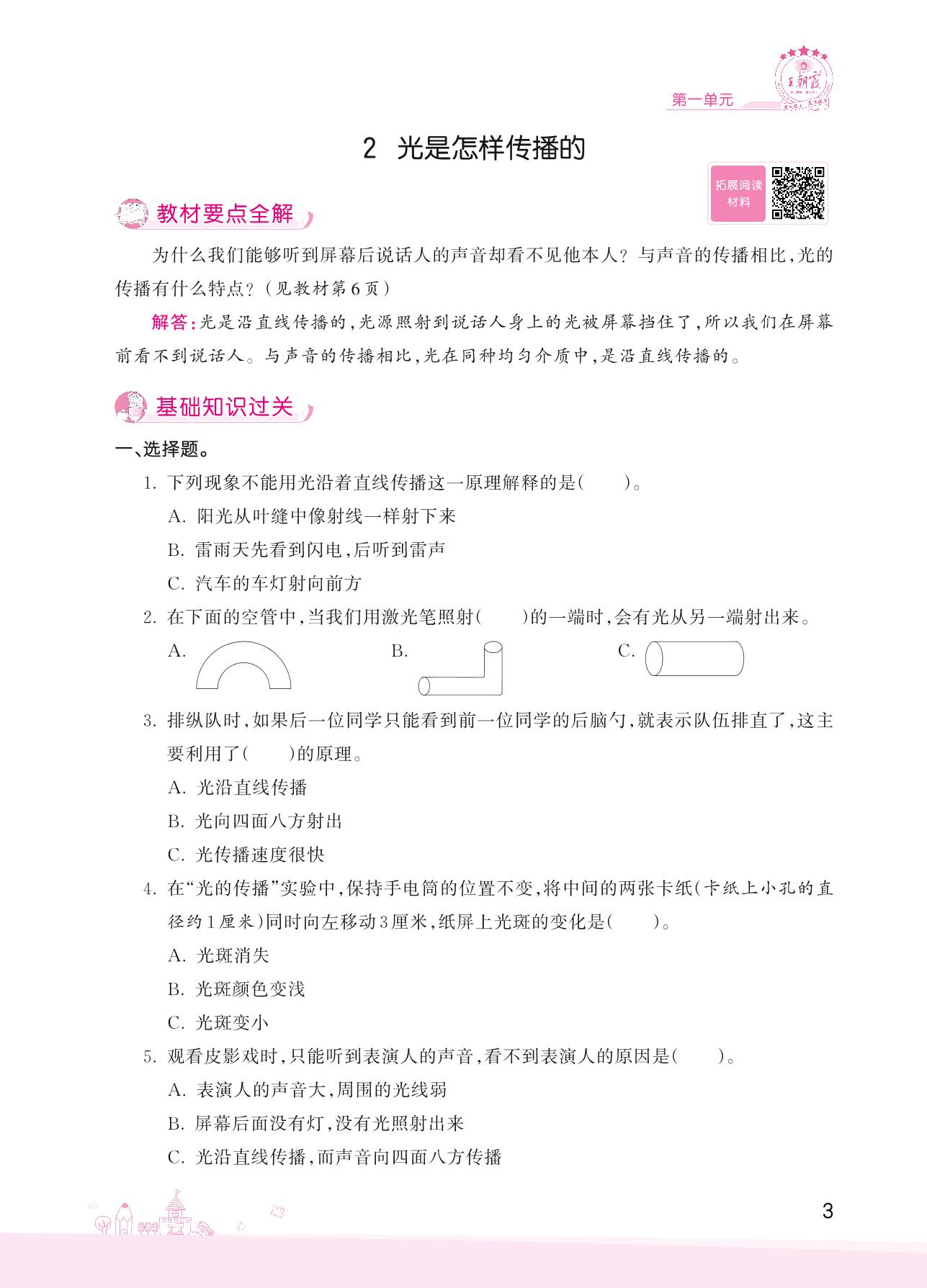 2022上册五年级科学教科版 第一单元 光——2 光是怎样传播的