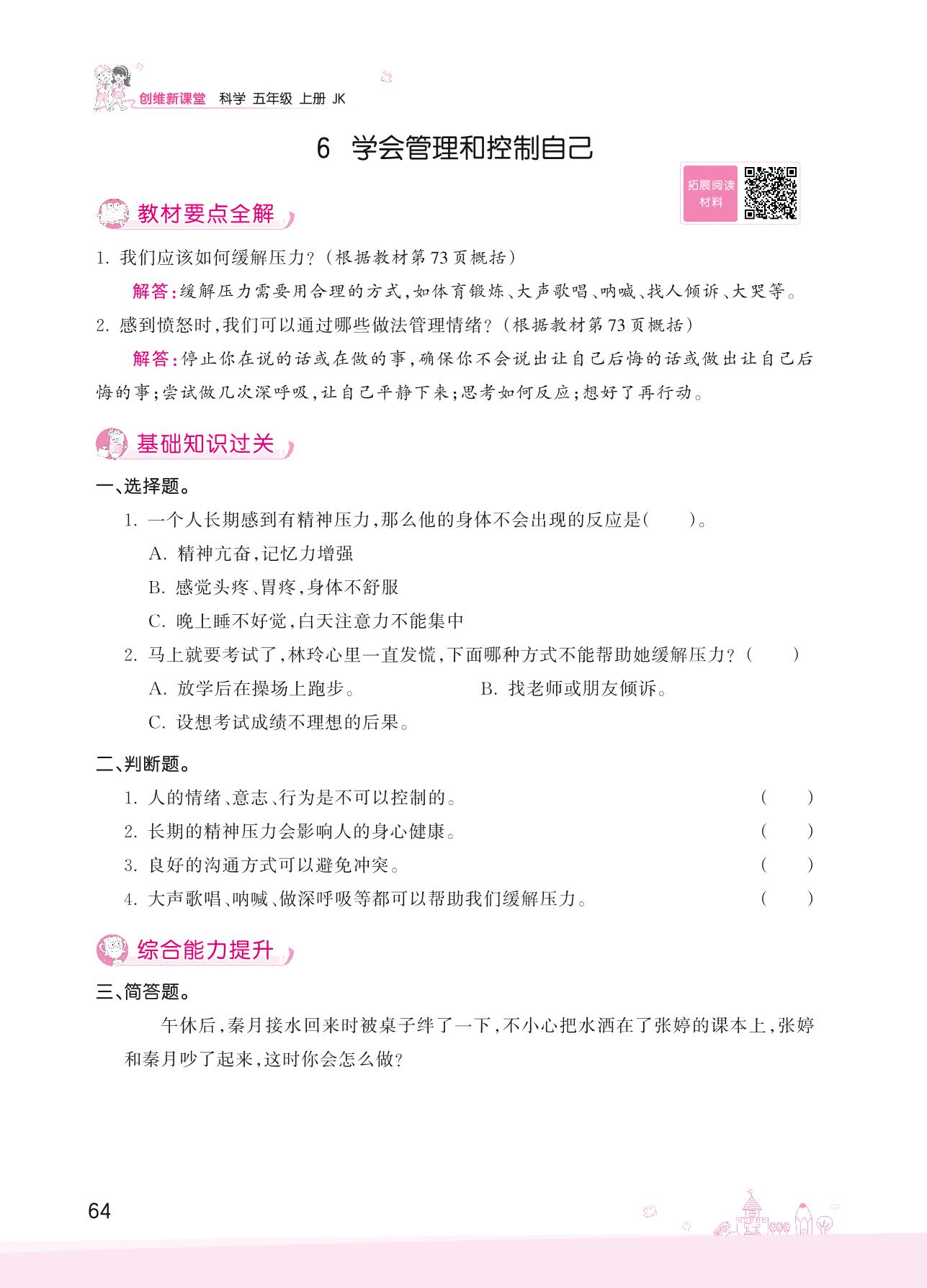 2022上册五年级科学教科版 第四单元 健康生活——6 学会管理和控制自己