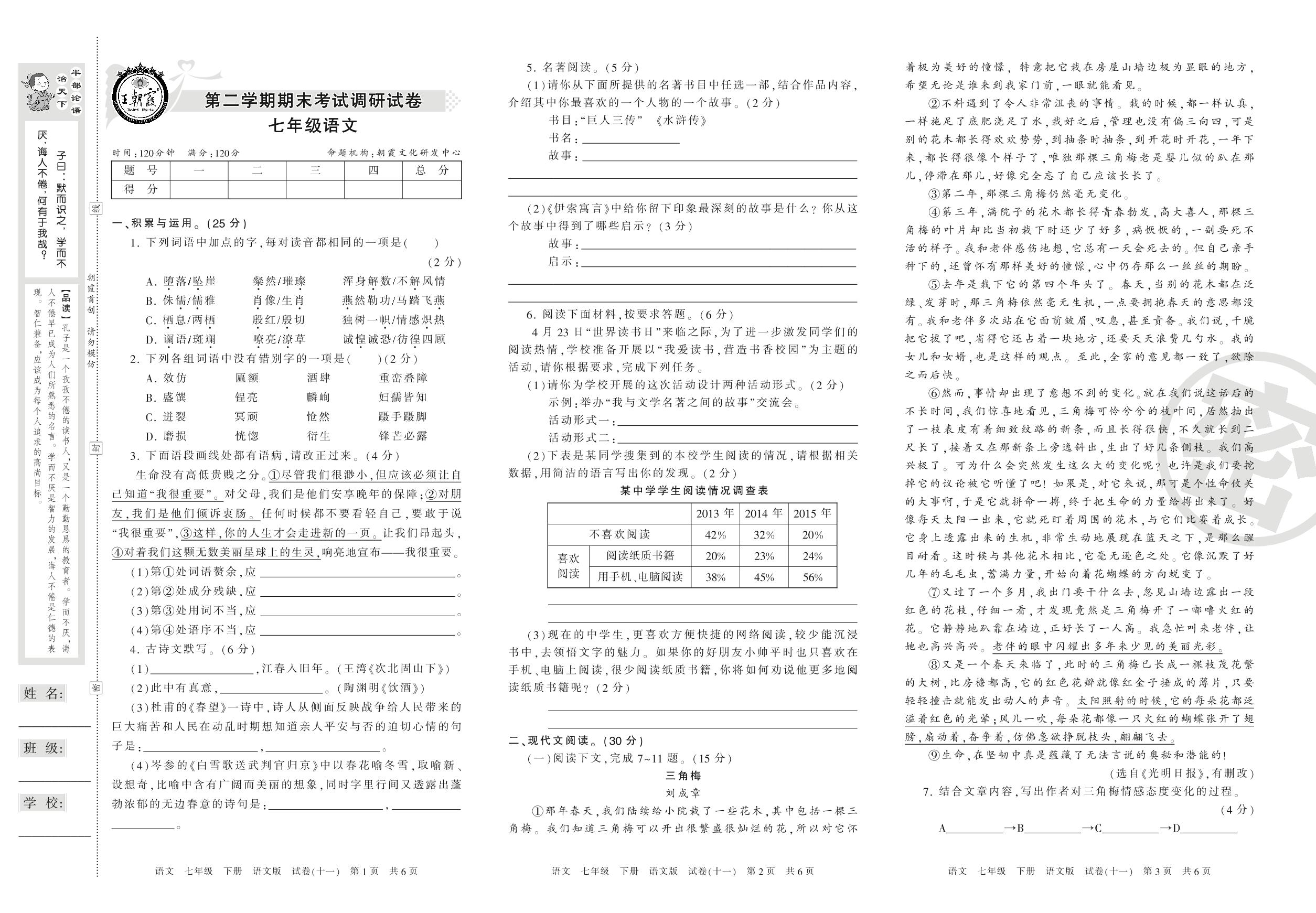 七年级语文语文版下册期末卷