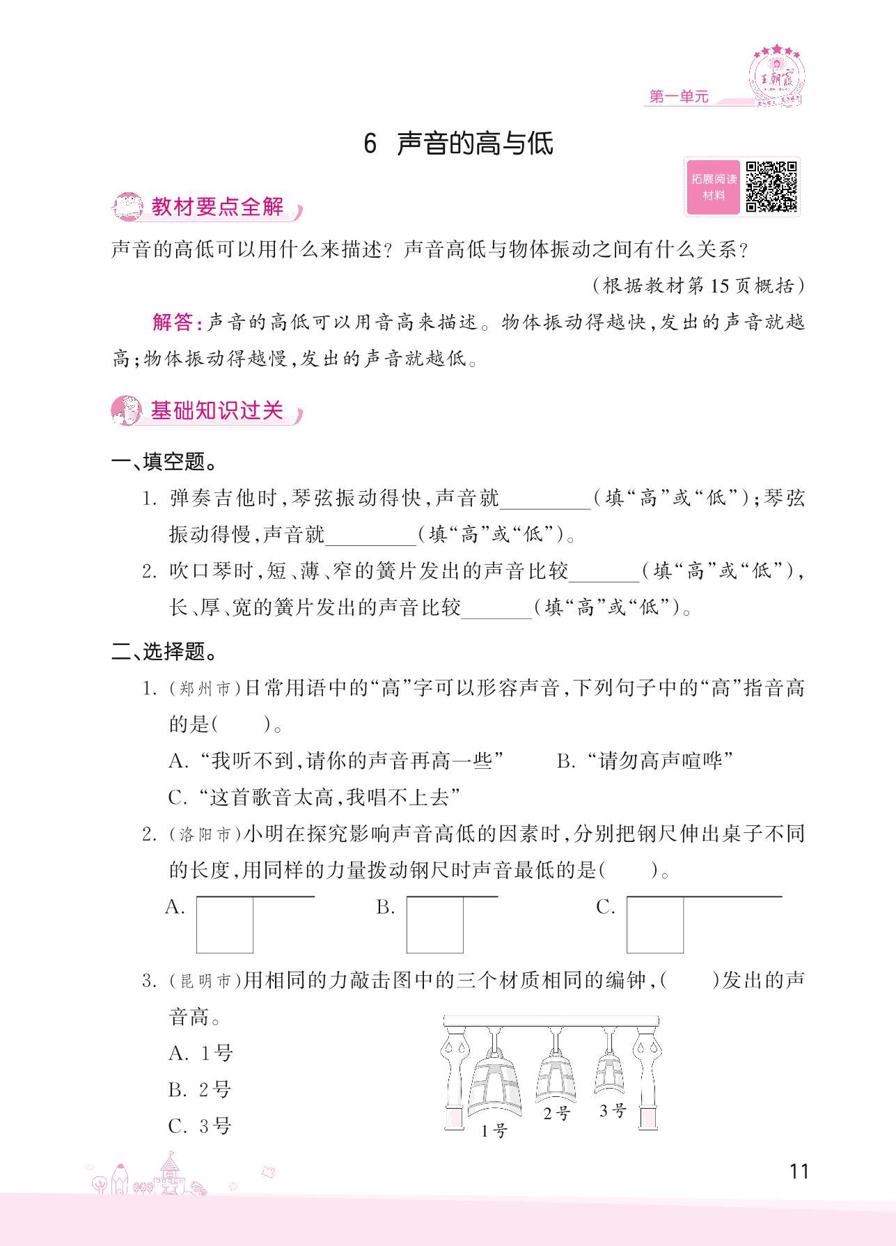 2022上册四年级科学教科版 第一单元 声音——6 声音的高与低