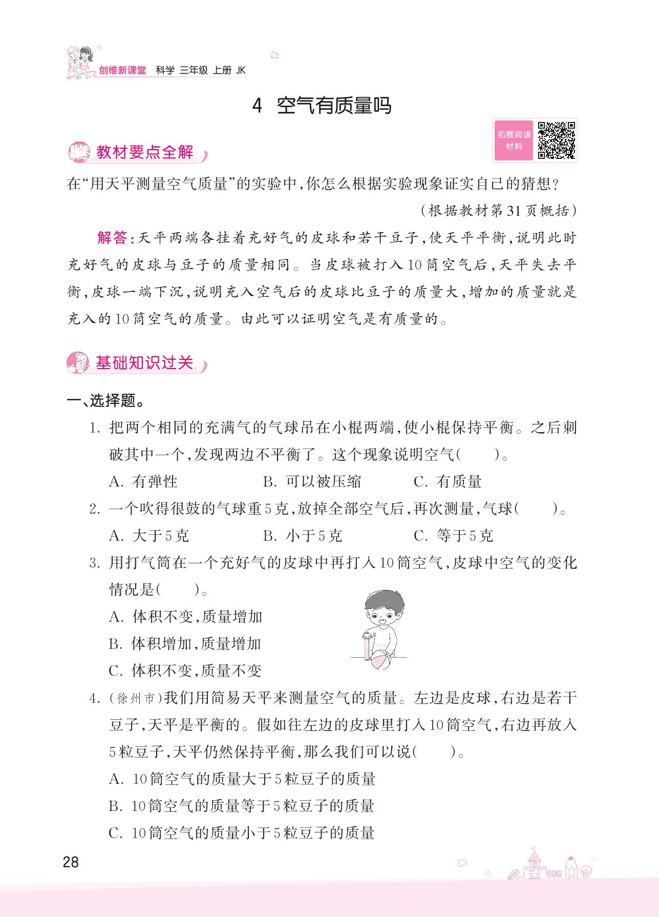 2022上册三年级科学教科版 第二单元 空气——4 空气有质量吗