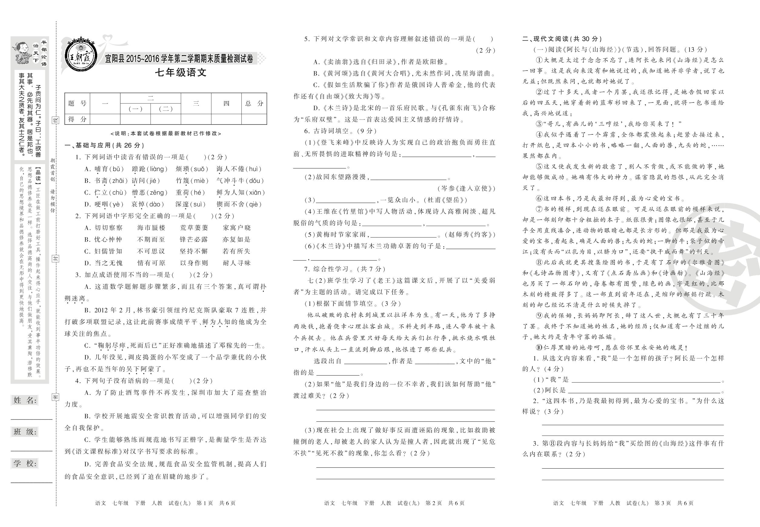 2015-2016学年第二学期洛阳市宜阳县七年级语文试卷(人教版)【9】