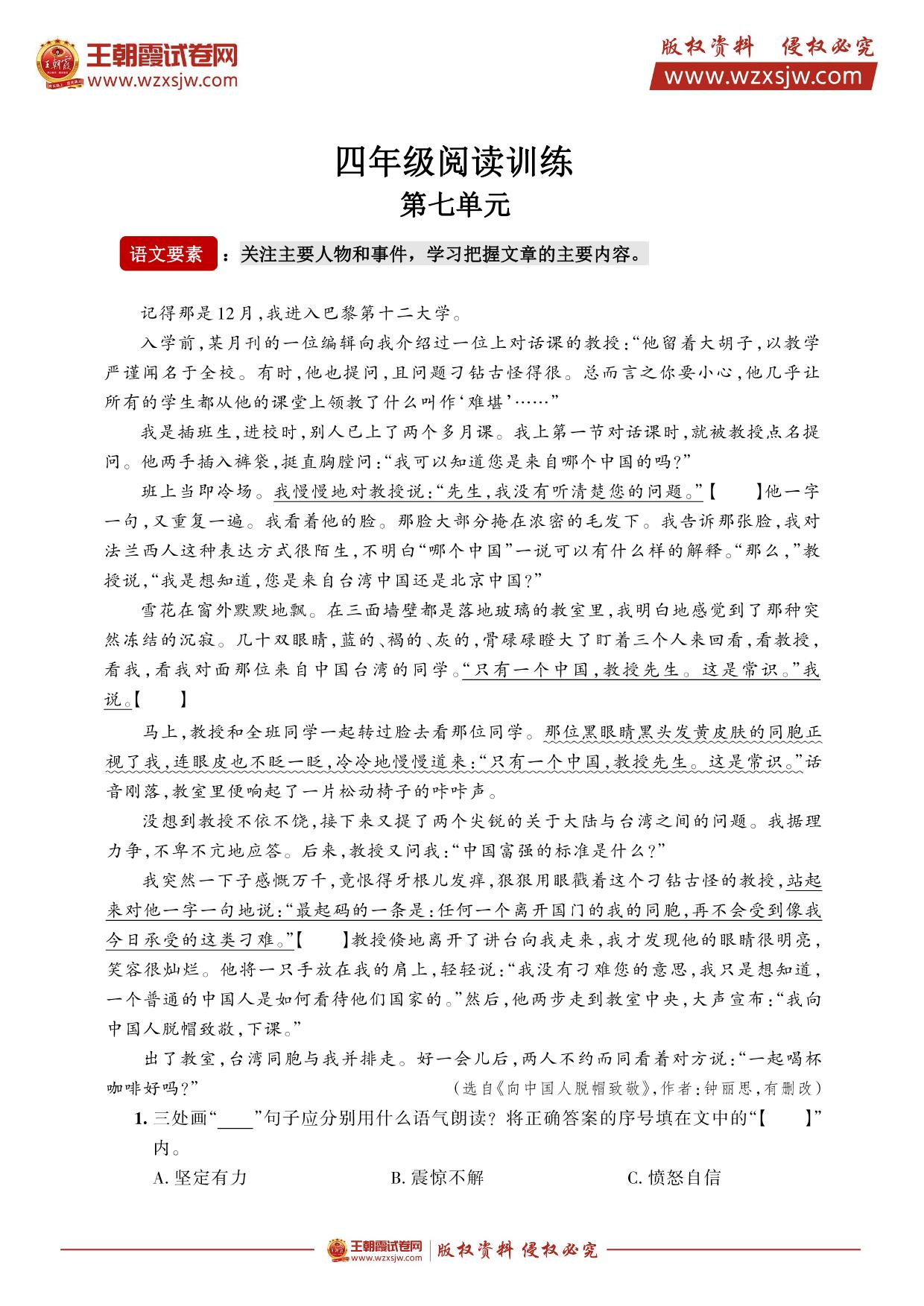 四年级语文阅读训练·第七单元