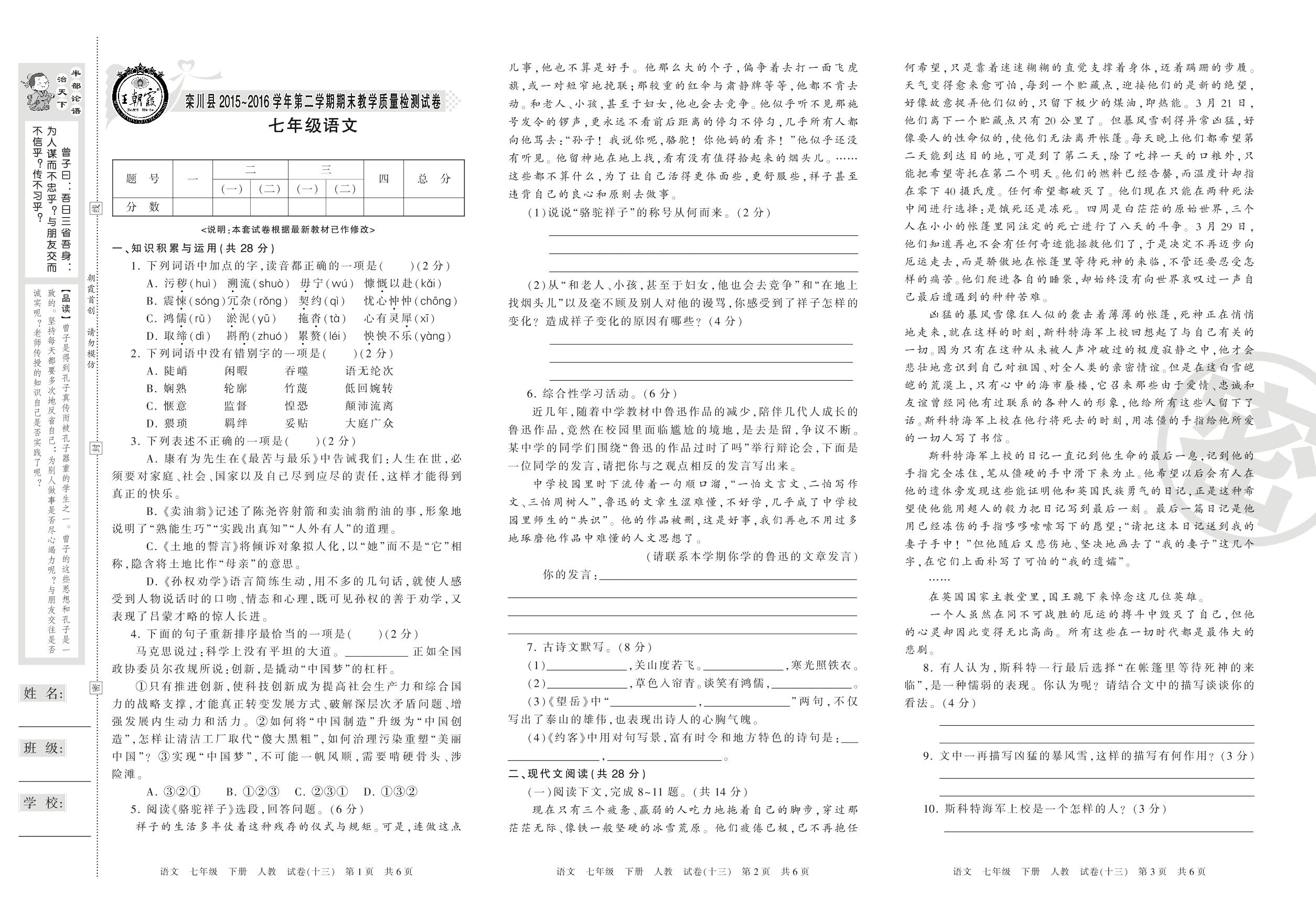 2015-2016学年第二学期洛阳市栾川县七年级语文试卷(人教版)【13】