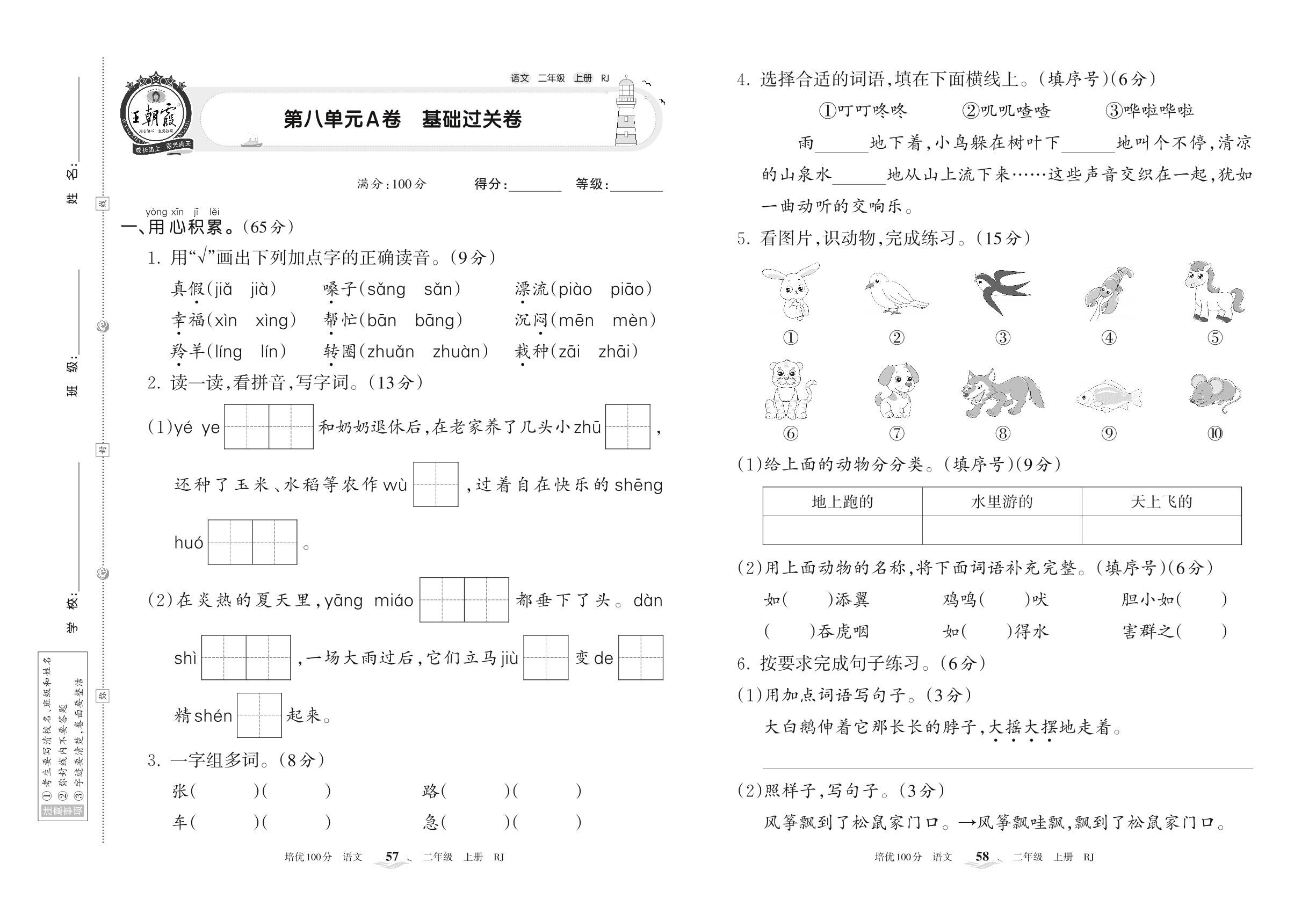 2022上册二年级语文人教版 第八单元A卷 基础过关卷