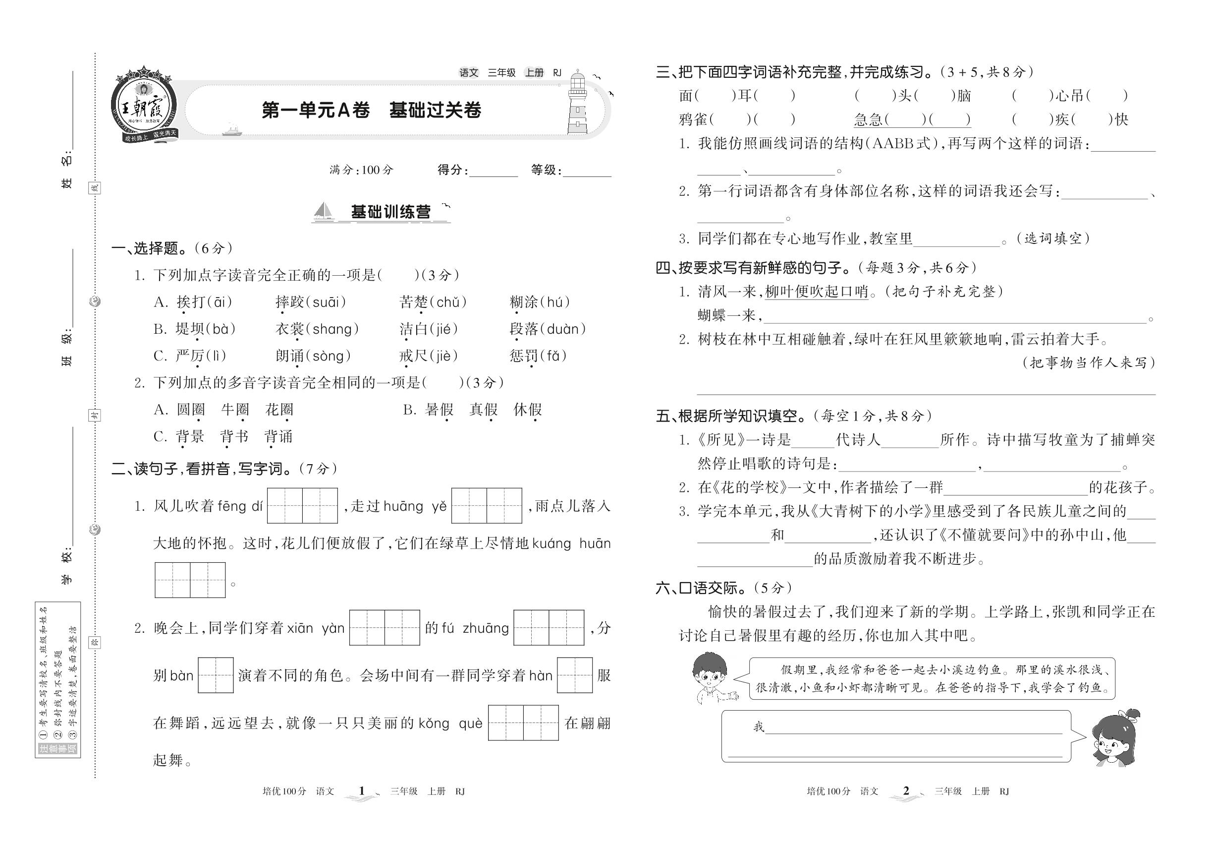 2022上册三年级语文人教版 第一单元A卷 基础过关卷
