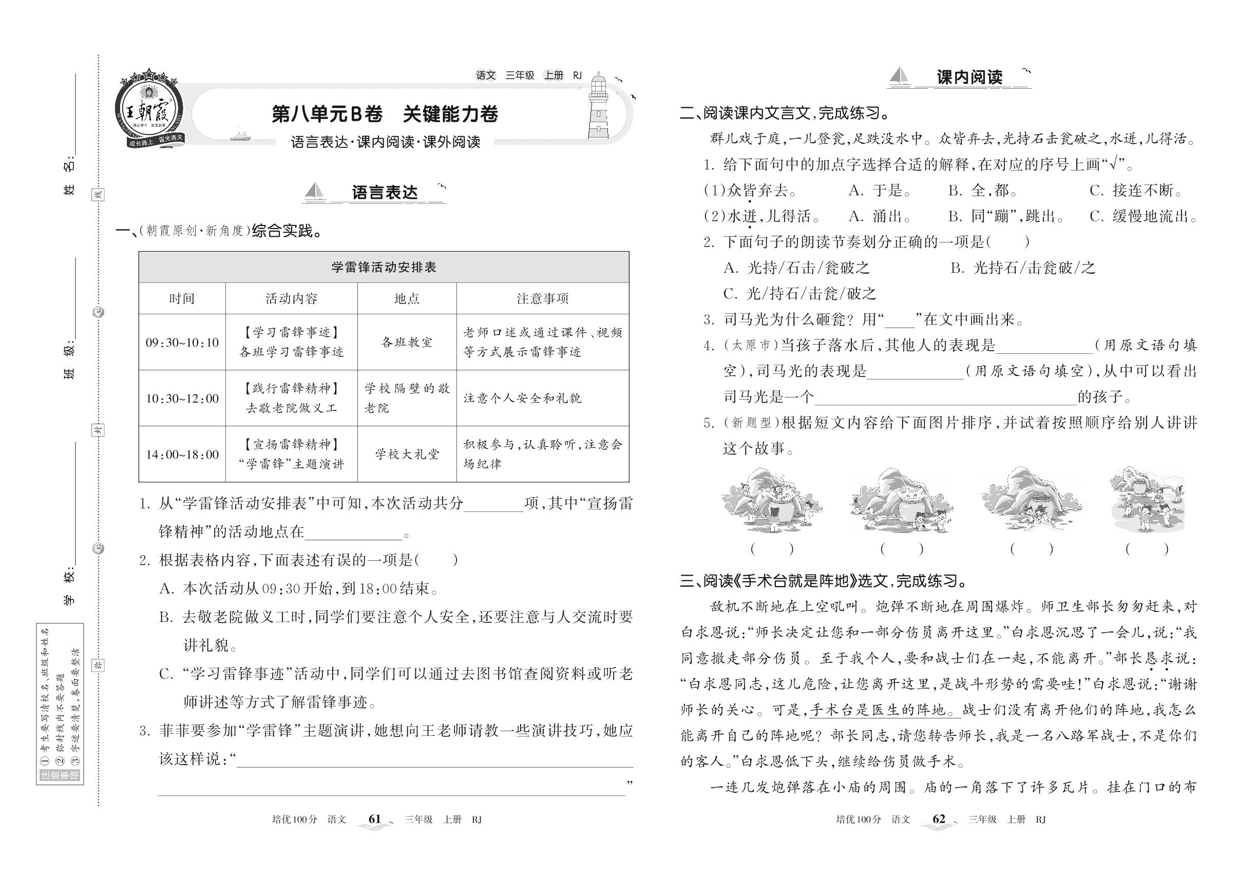 2022上册三年级语文人教版 第八单元B卷 关键能力卷