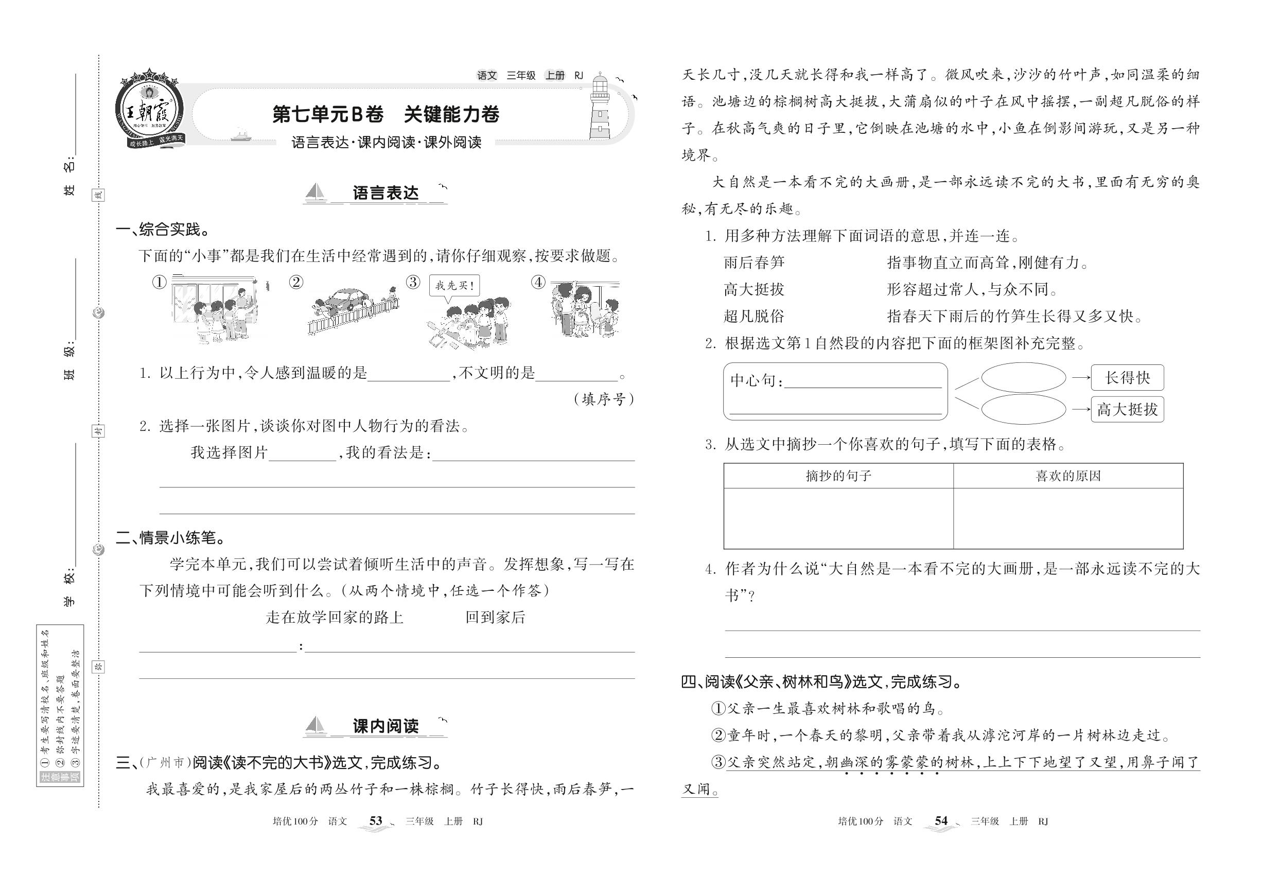2022上册三年级语文人教版 第七单元B卷 关键能力卷