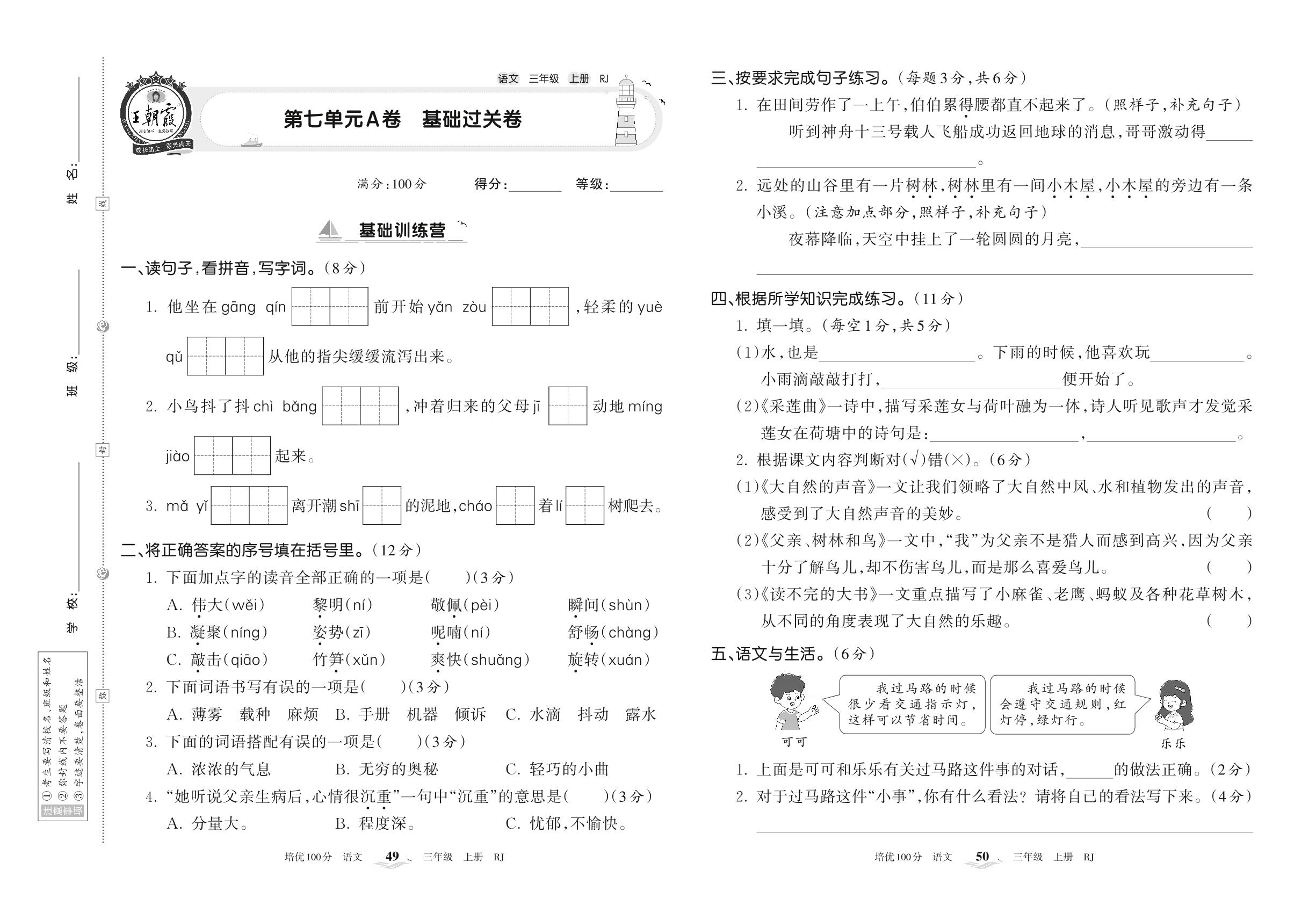 2022上册三年级语文人教版 第七单元A卷 基础过关卷