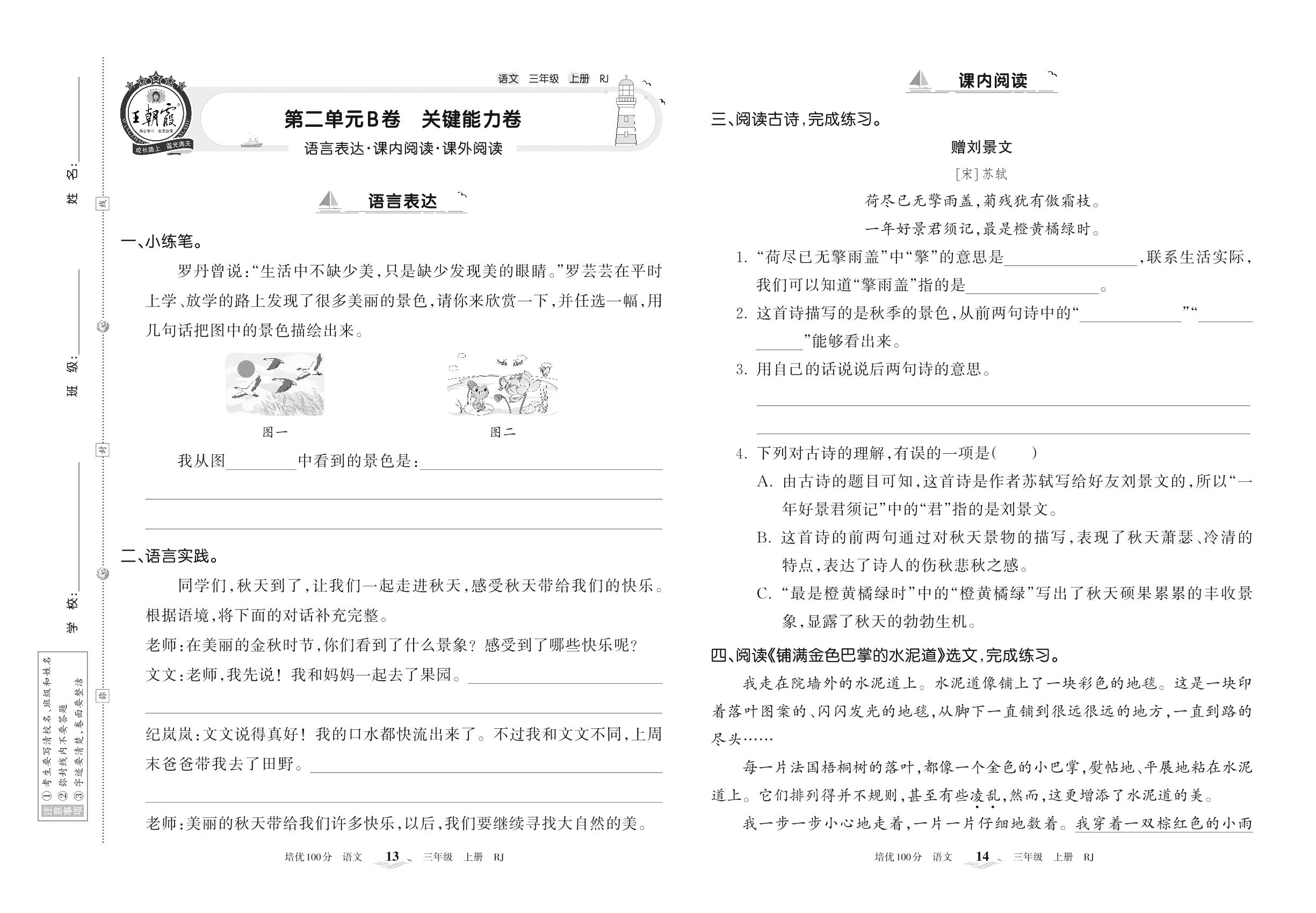 2022上册三年级语文人教版 第二单元B卷 关键能力卷