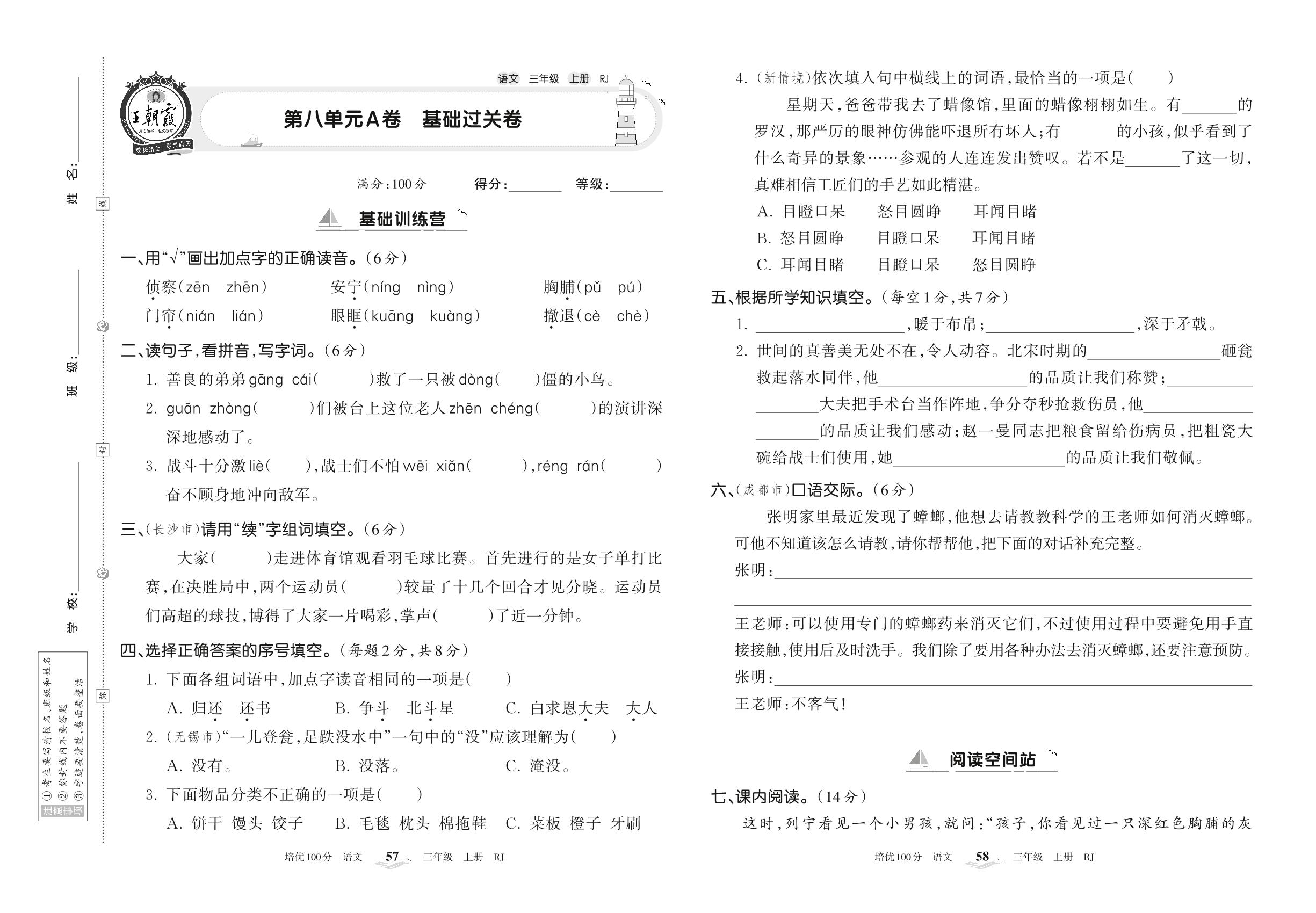 2022上册三年级语文人教版 第八单元A卷 基础过关卷