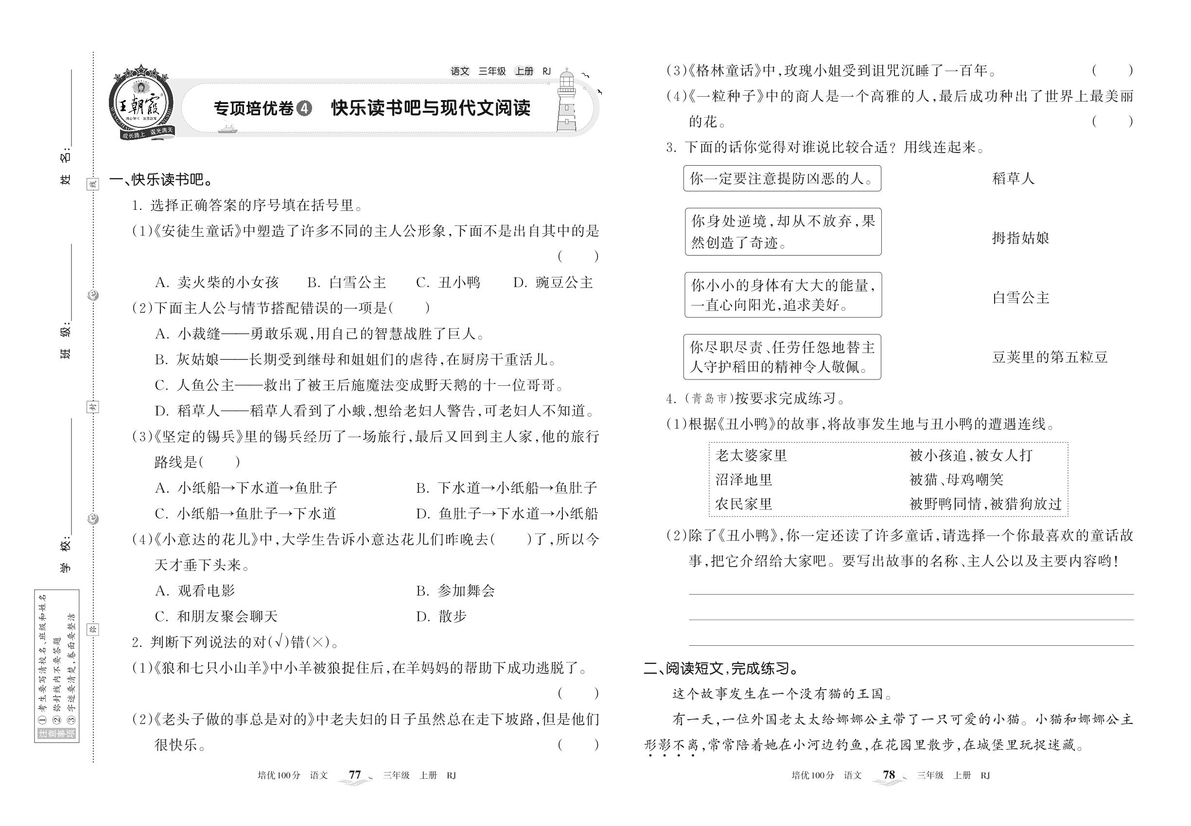 2022上册三年级语文人教版 专项培优卷4 快乐读书吧与现代文阅读