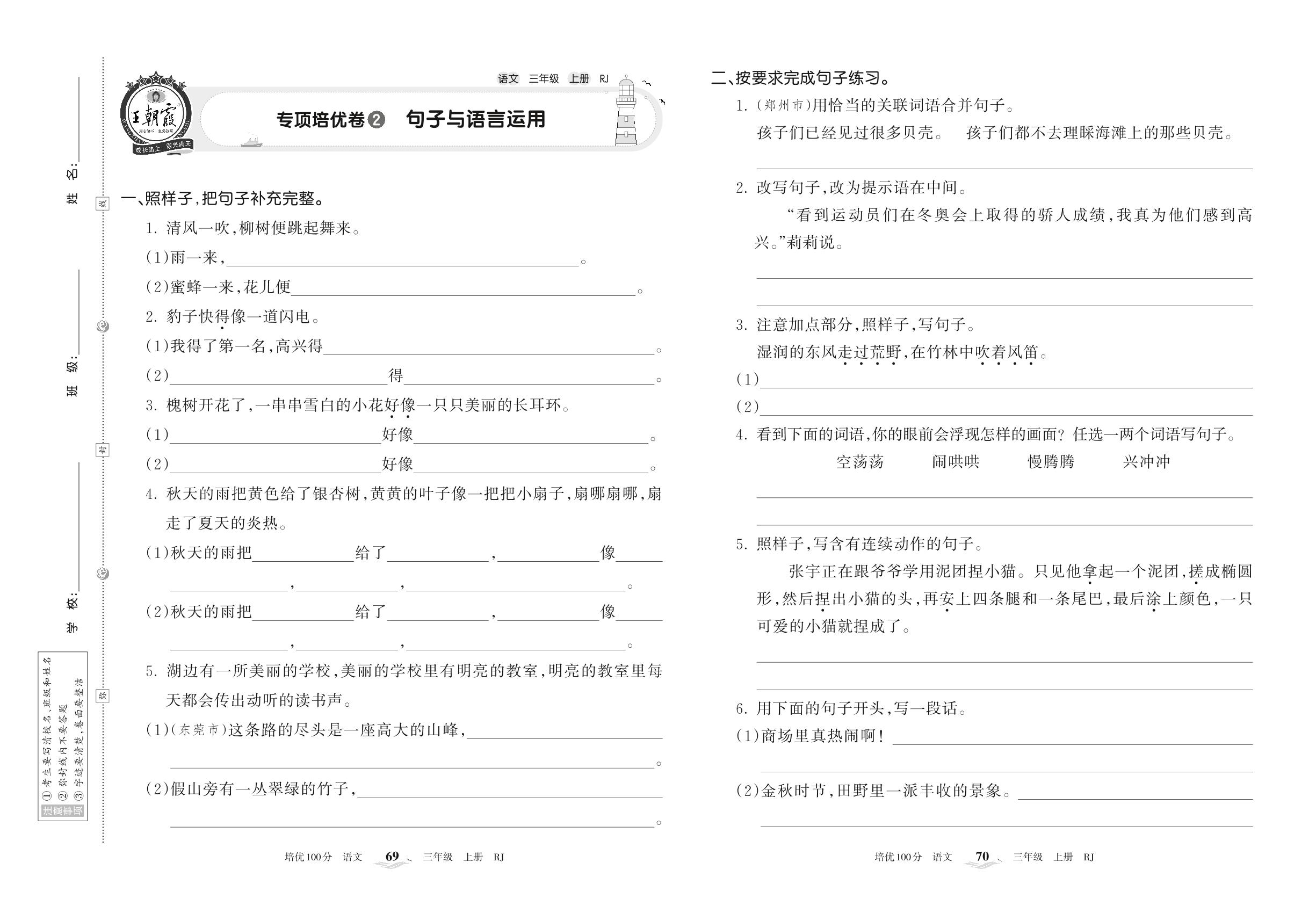 2022上册三年级语文人教版 专项培优卷2 句子与语言运用