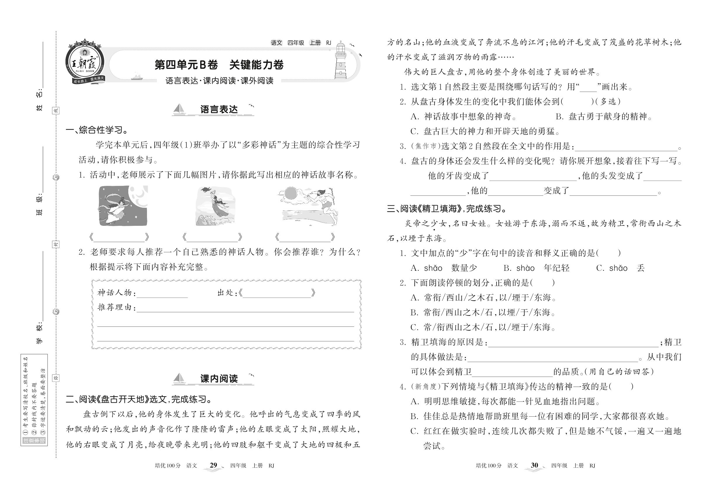 2022上册四年级语文人教版 第四单元B卷 关键能力卷