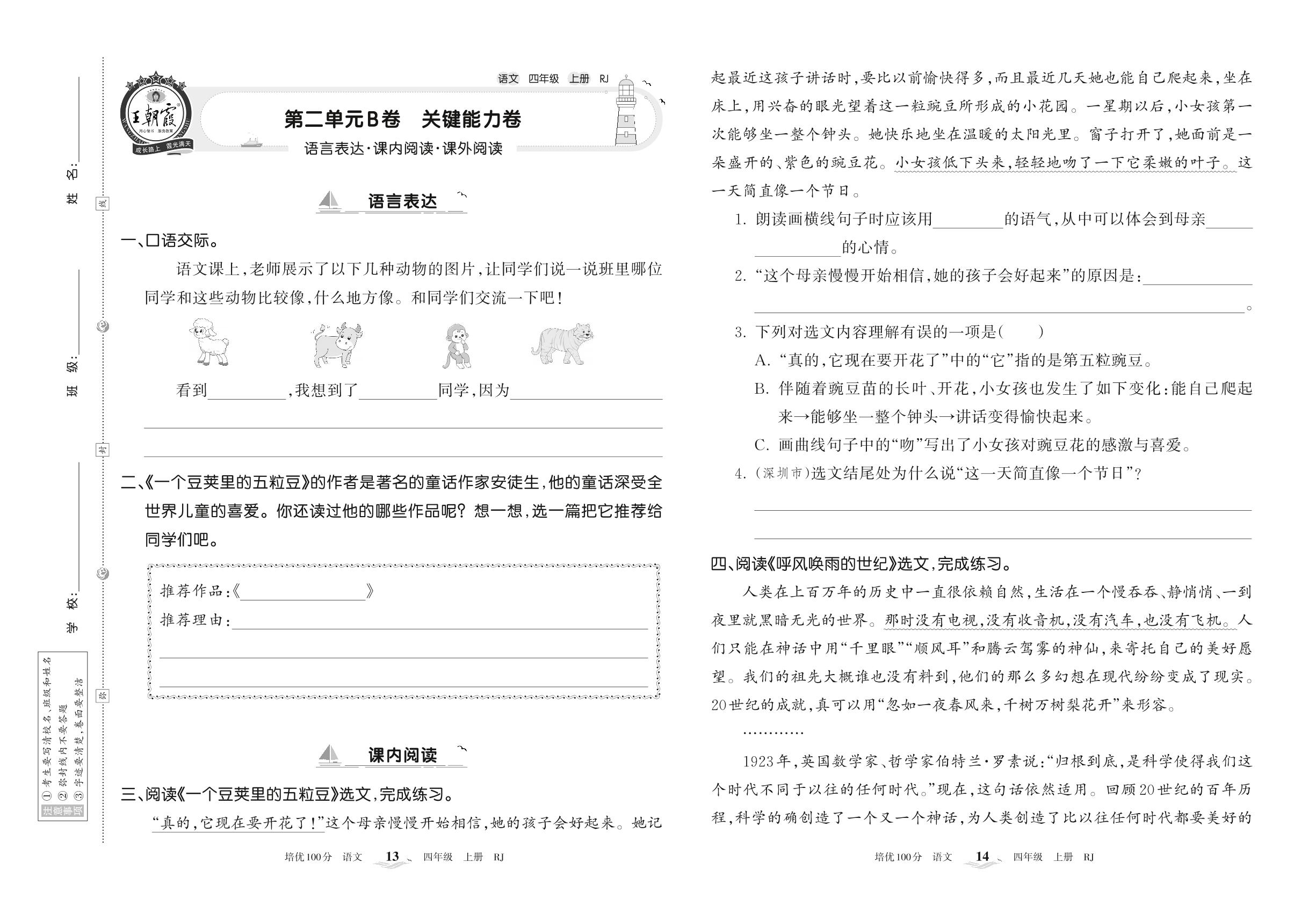 2022上册四年级语文人教版 第二单元B卷 关键能力卷