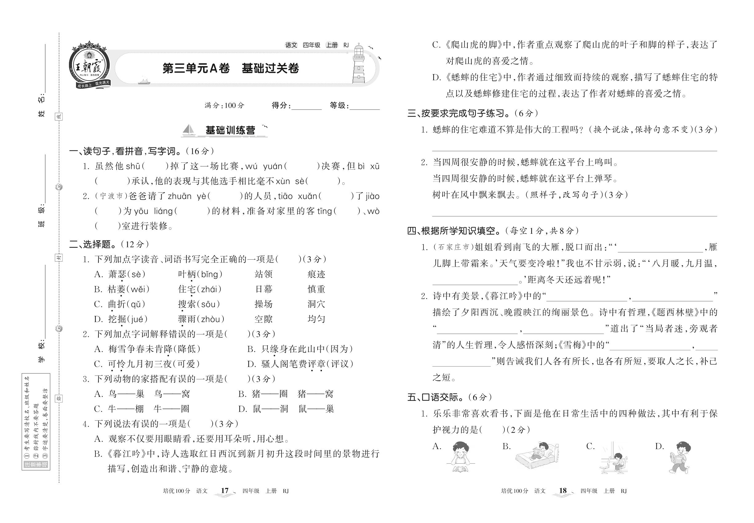 2022上册四年级语文人教版 第三单元A卷 基础过关卷