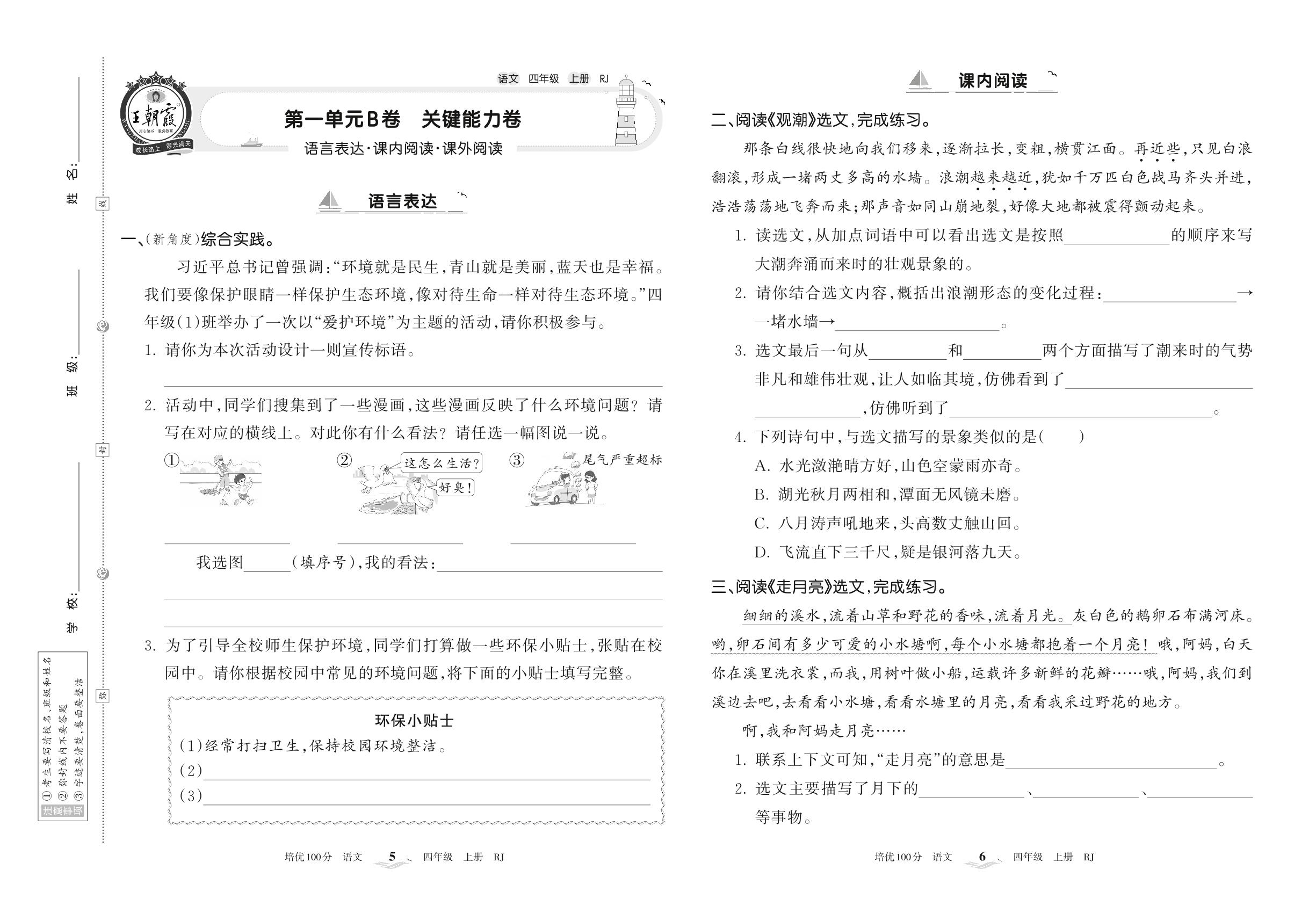 2022上册四年级语文人教版 第一单元B卷 关键能力卷