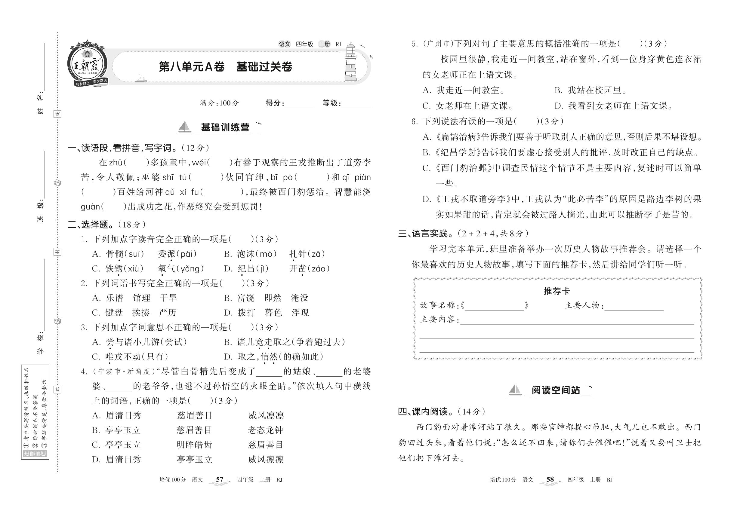 2022上册四年级语文人教版 第八单元A卷 基础过关卷