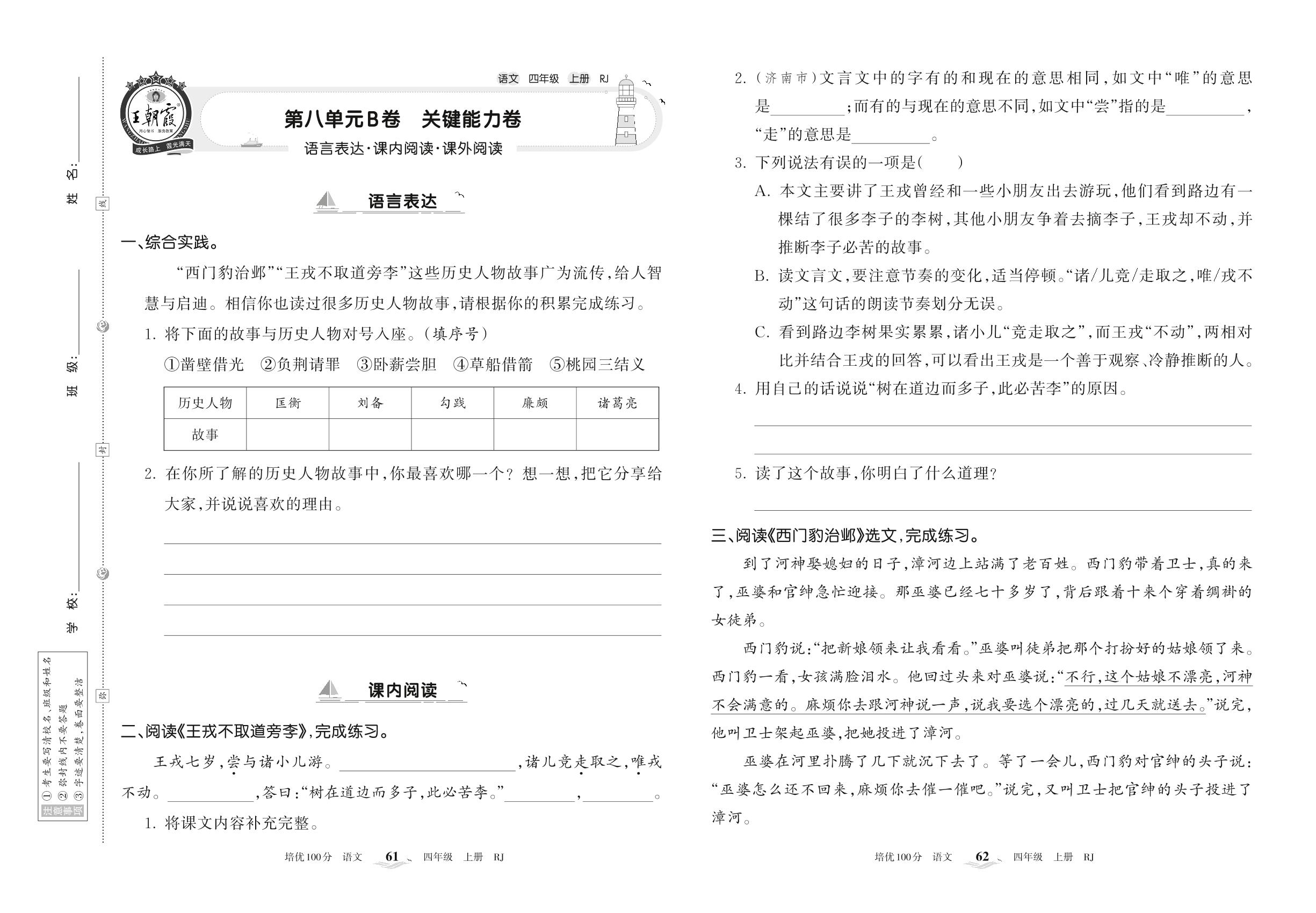 2022上册四年级语文人教版 第八单元B卷 关键能力卷
