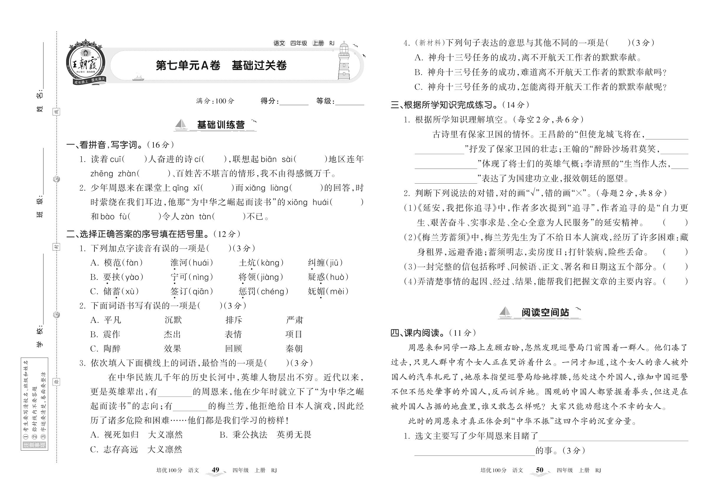 2022上册四年级语文人教版 第七单元A卷 基础过关卷
