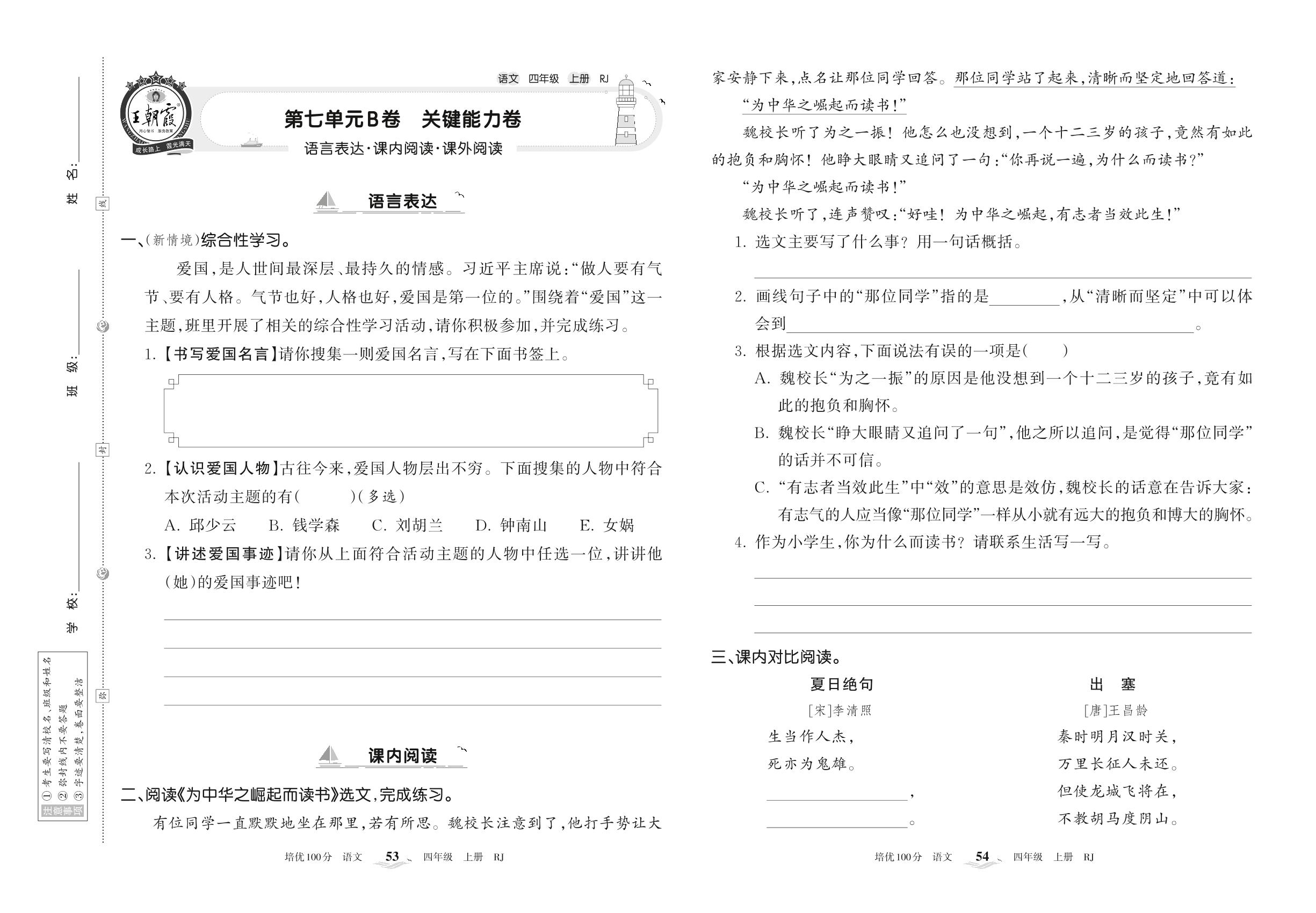 2022上册四年级语文人教版 第七单元B卷 关能力卷