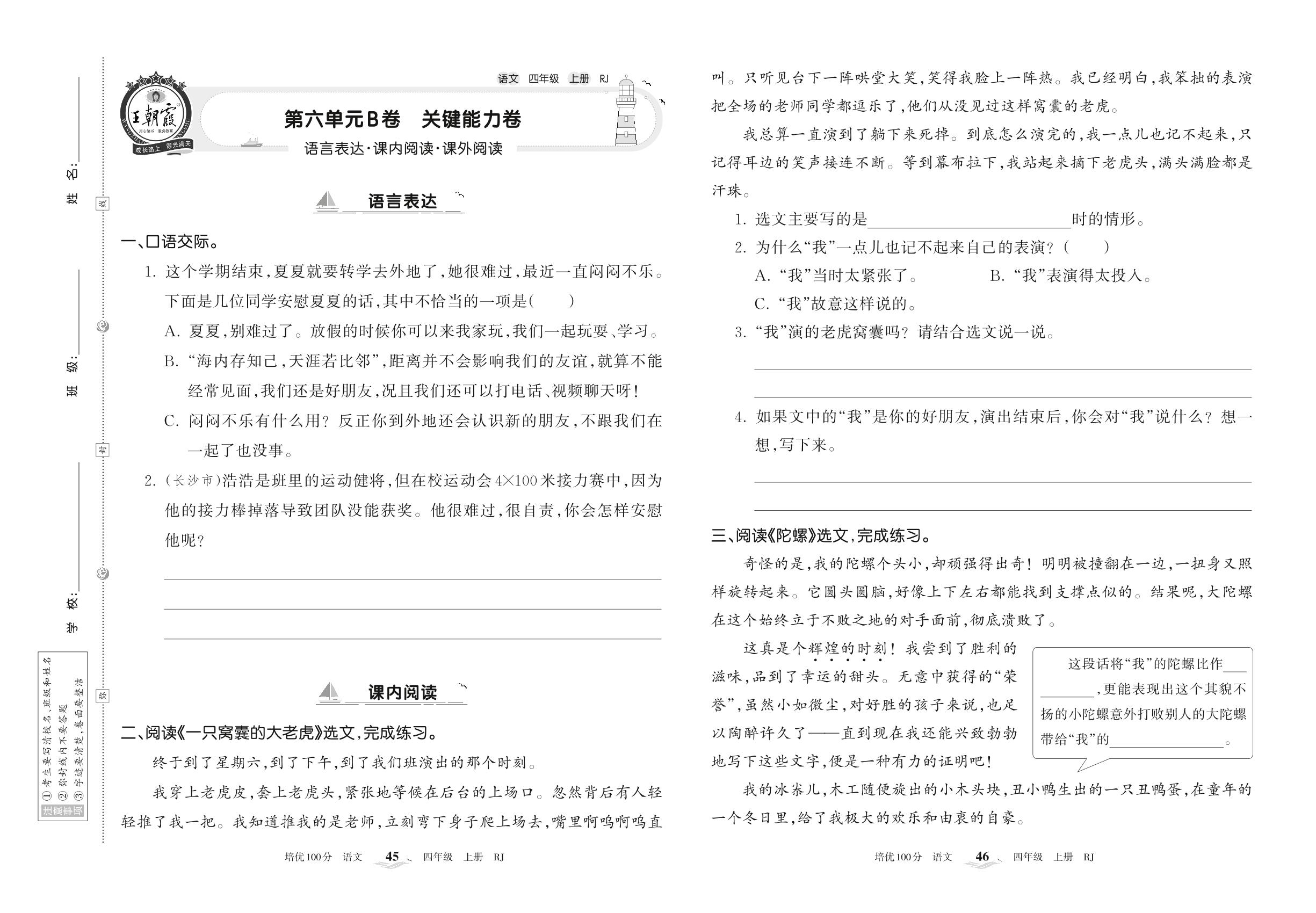 2022上册四年级语文人教版 第六单元B卷 关键能力卷