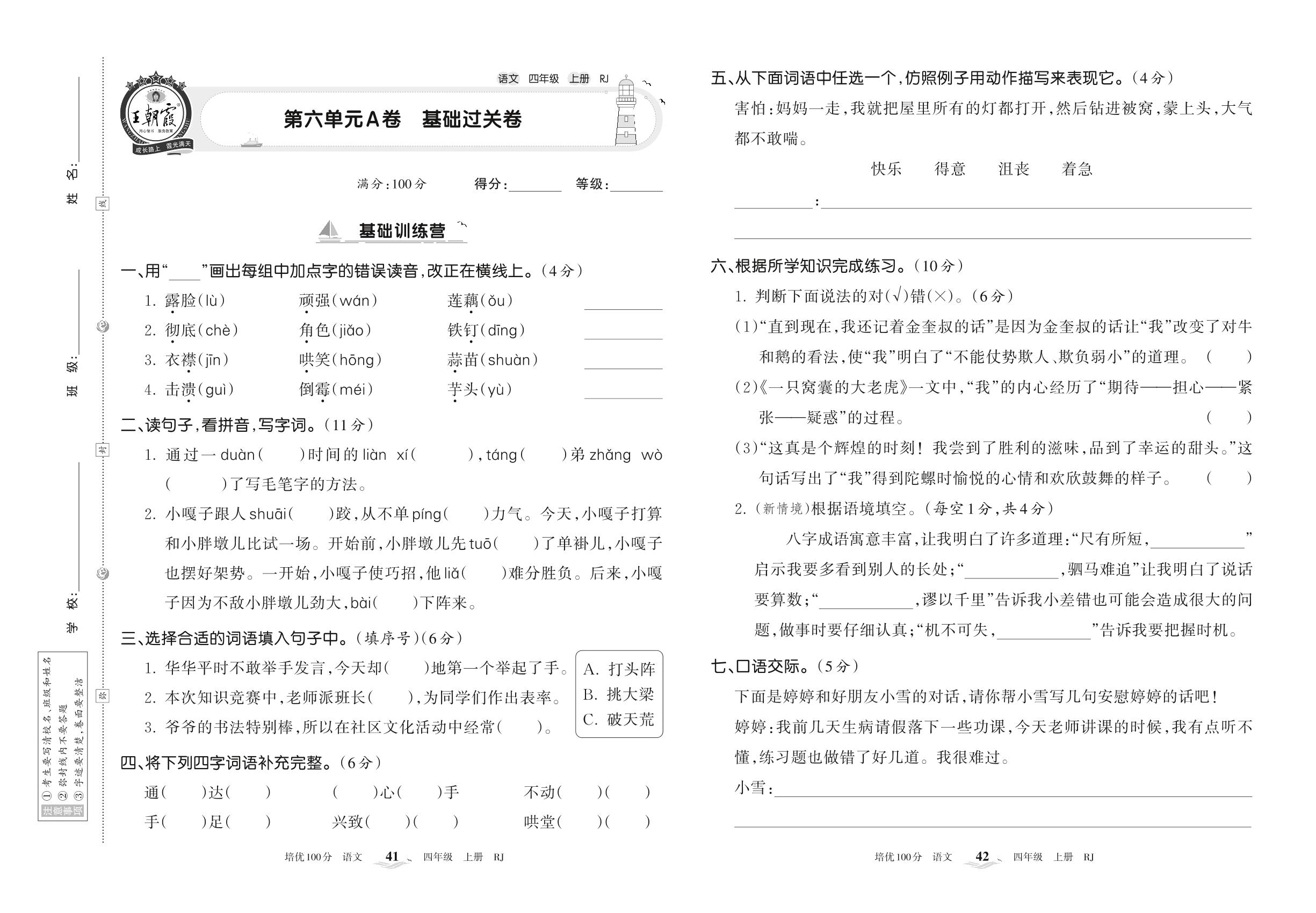 2022上册四年级语文人教版 第六单元A卷 基础过关卷