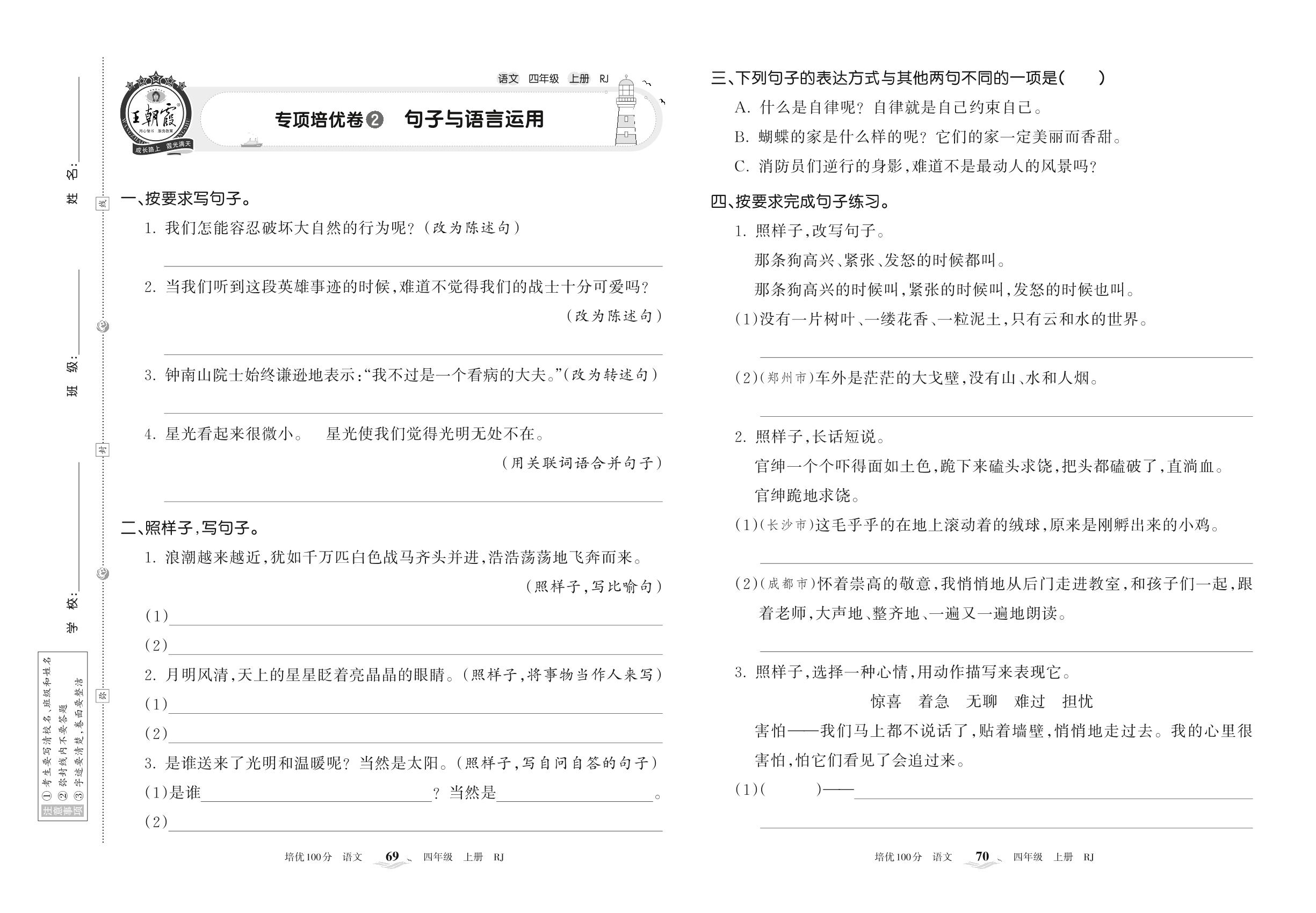 2022上册四年级语文人教版 专项培优卷2 句子与语言运用