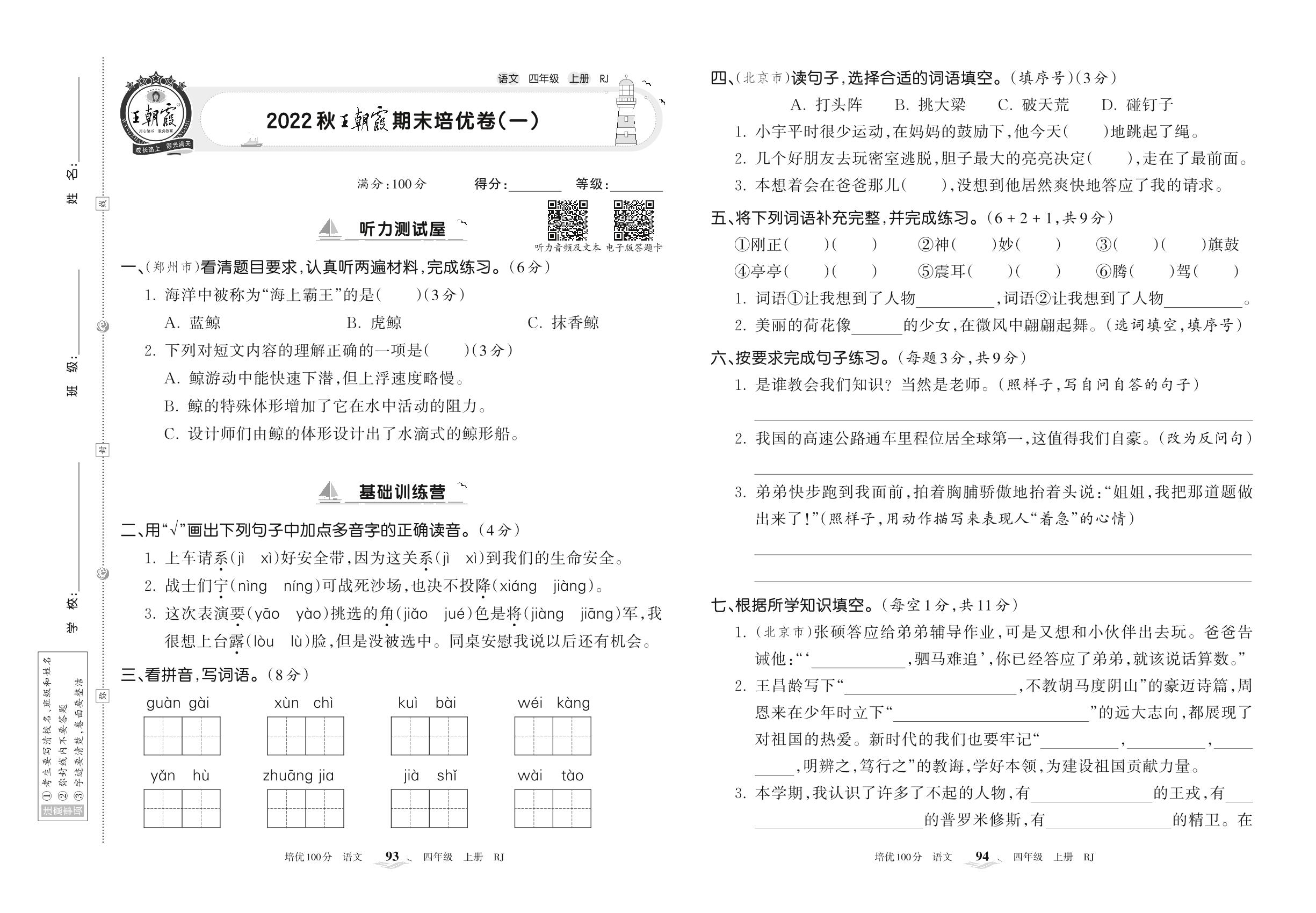 2022上册四年级语文人教版 2022秋王朝霞期末培优卷(一)