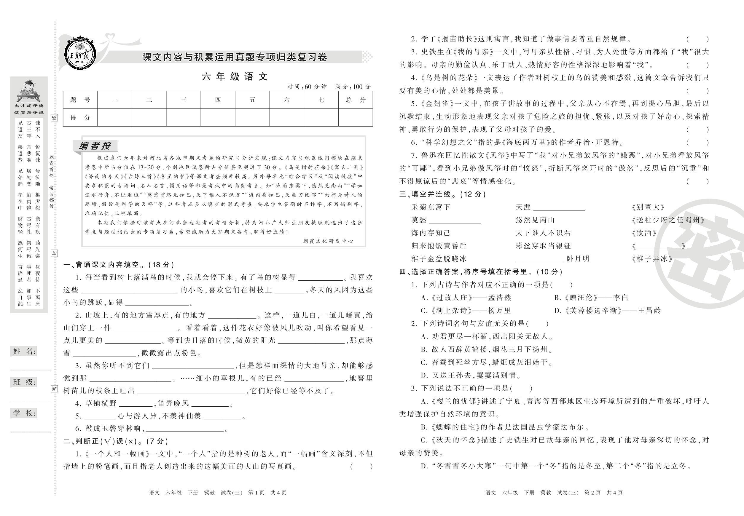 王朝霞期末专项卷六年级下册语文(冀教版)_R21080253244【3】