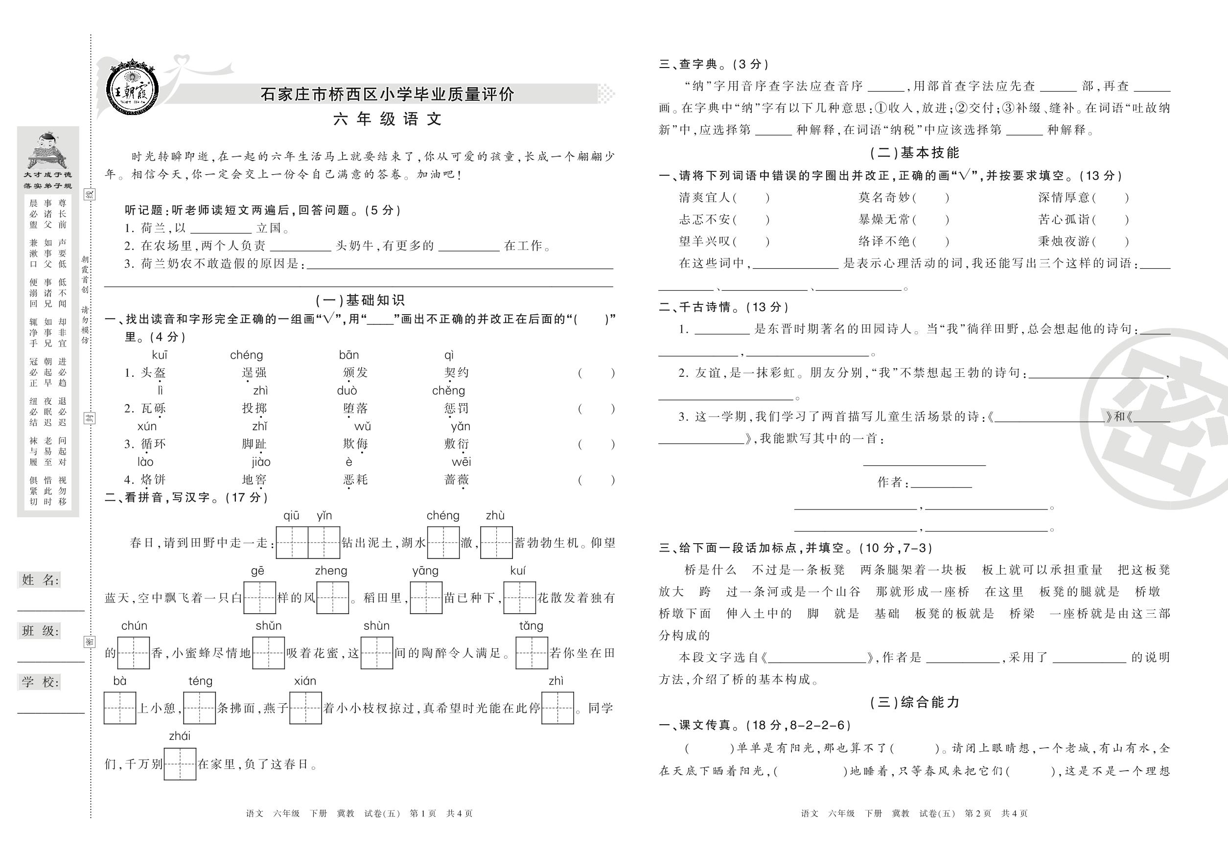 六年级语文冀教版下册期末卷