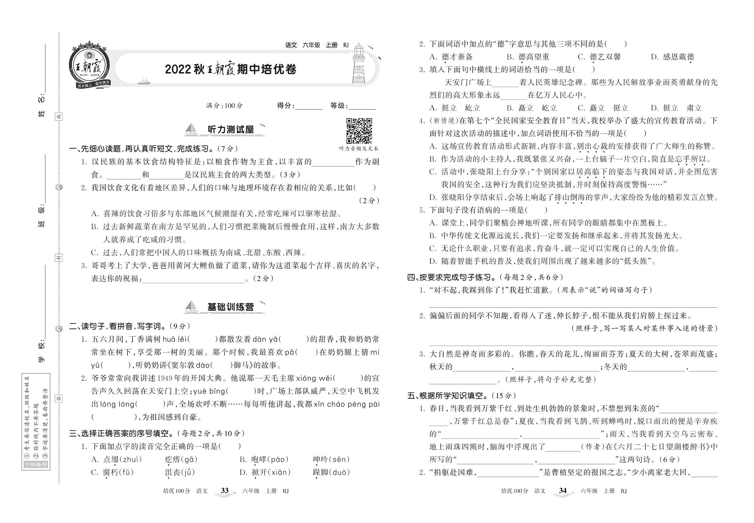 2022上册六年级语文人教版 2022秋王朝霞期中培优卷