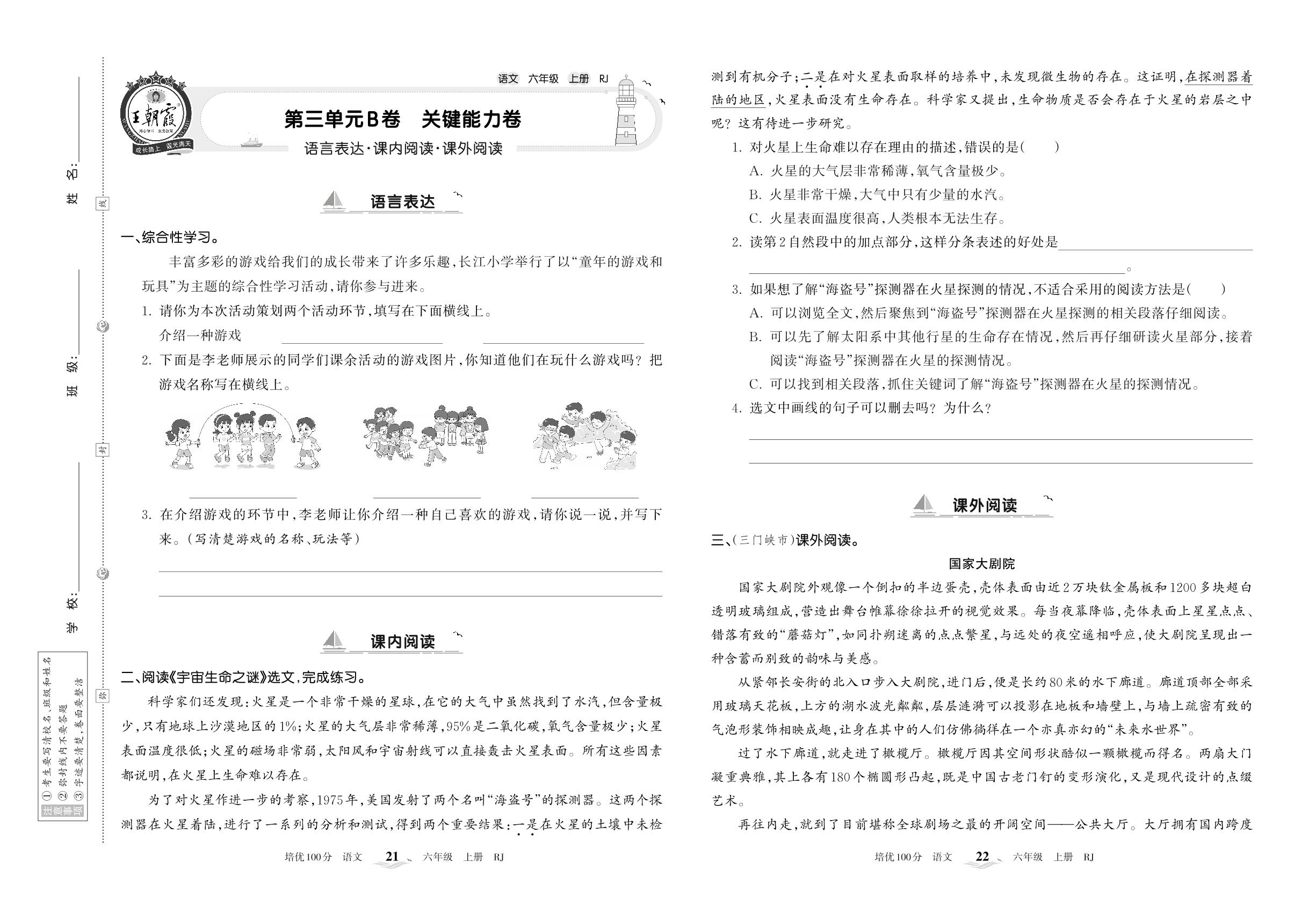 2022上册六年级语文人教版 第三单元B卷 关键能力卷