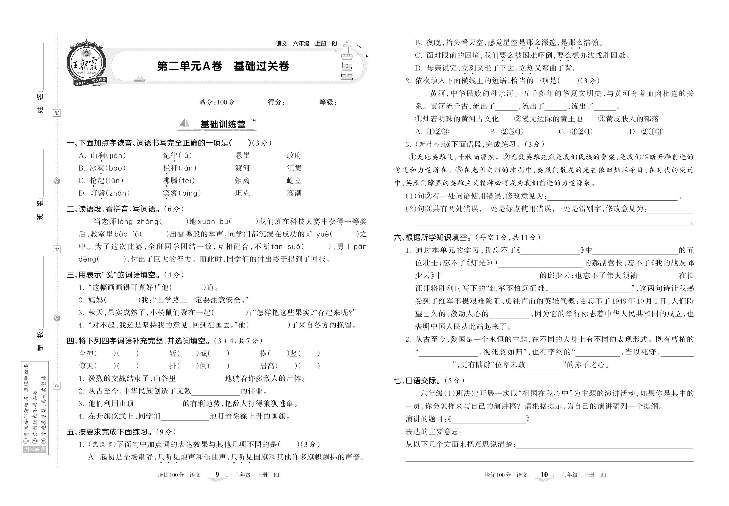 2022上册六年级语文人教版 第二单元A卷 基础过关卷