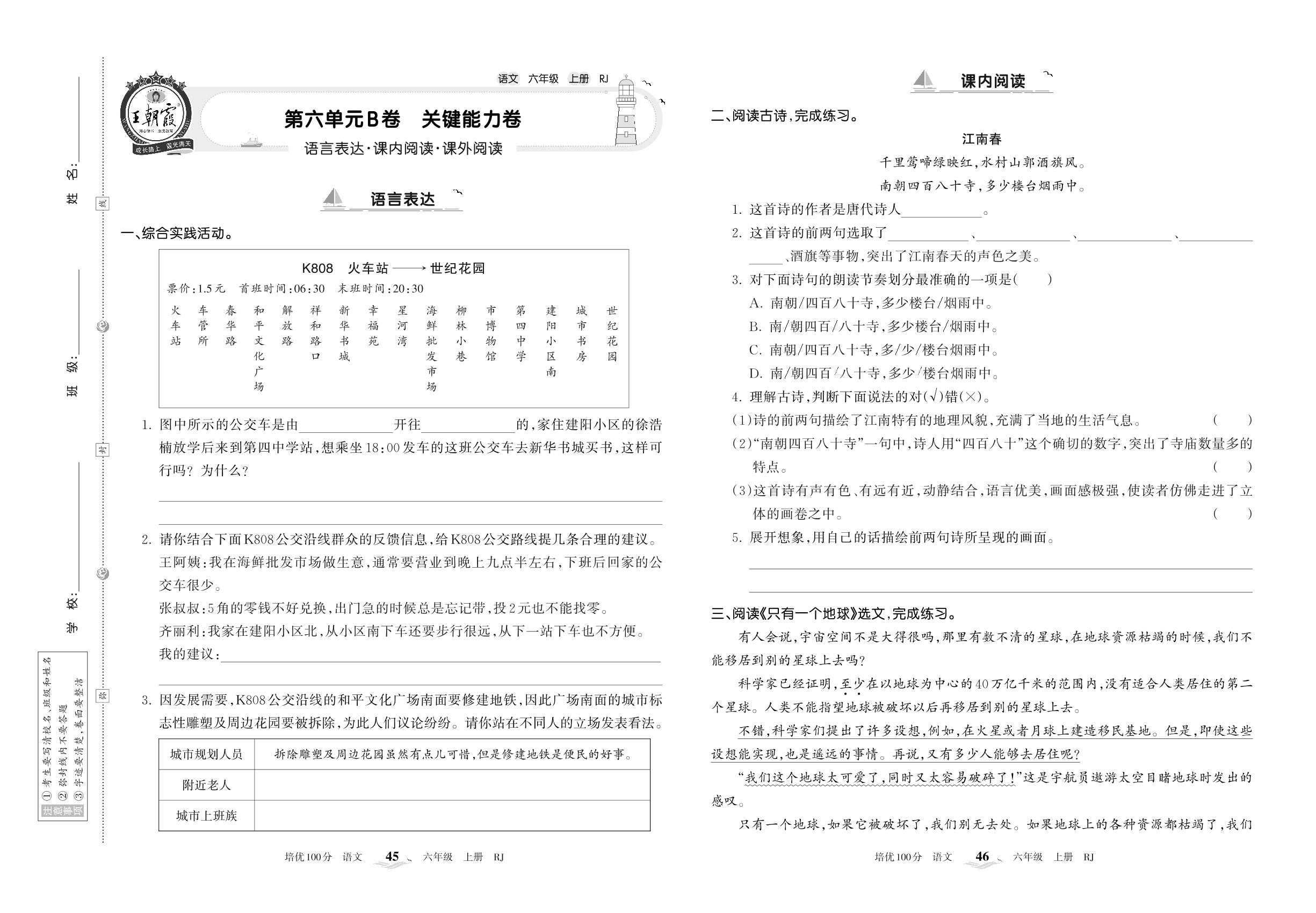 2022上册六年级语文人教版 第六单元B卷 关键能力卷