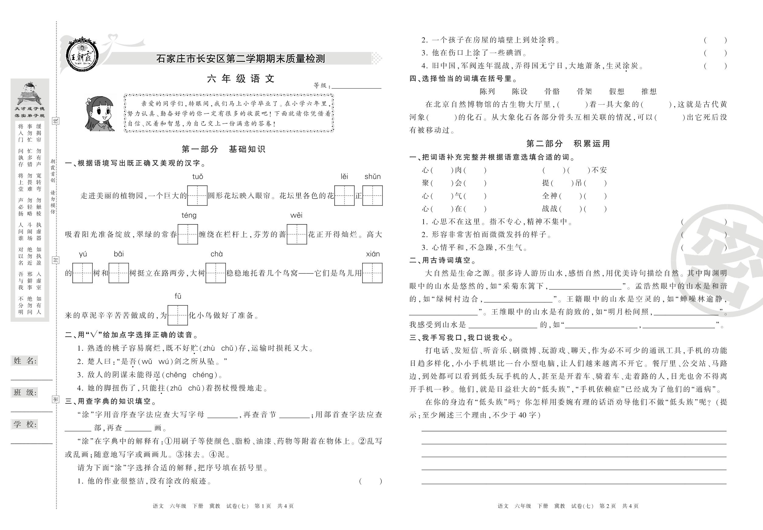 2015-2016学年第二学期石家庄市长安区六年级语文试卷(冀教版)【7】