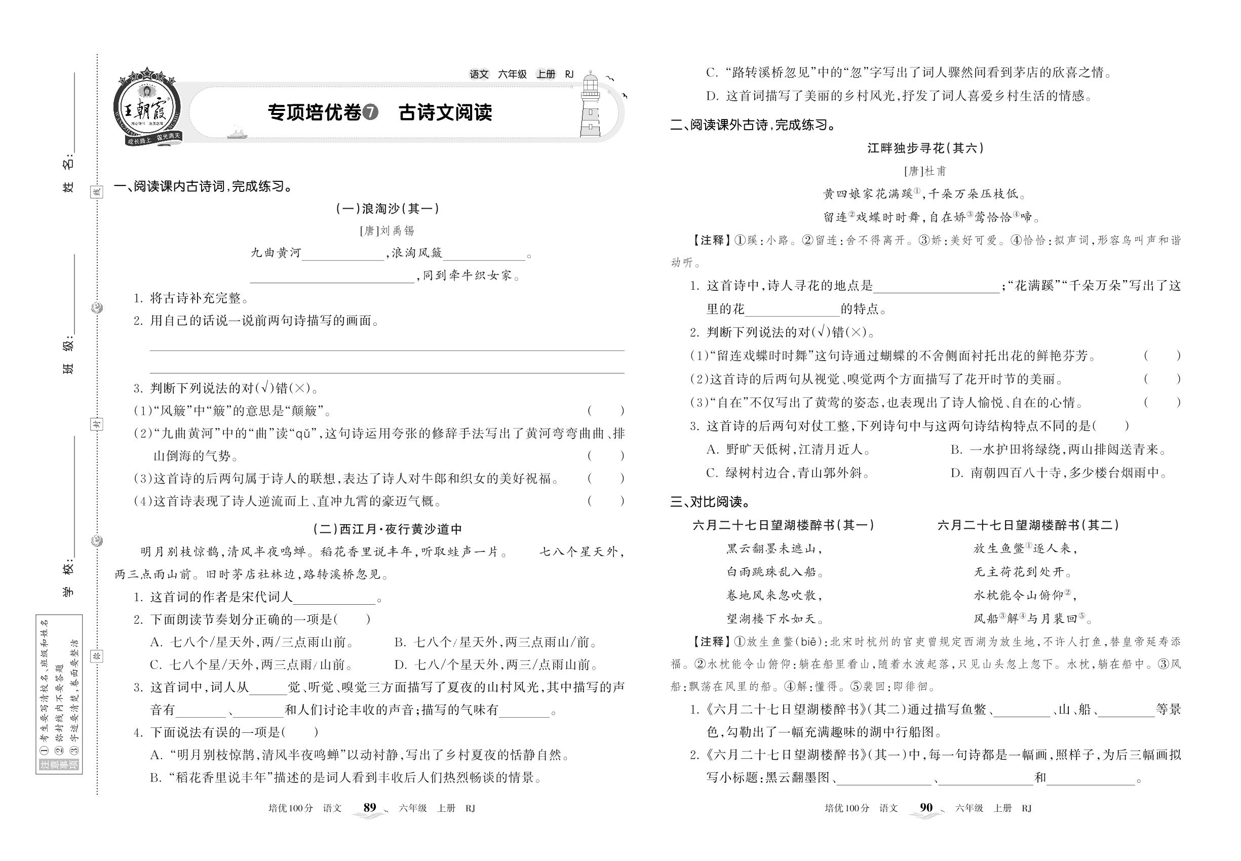 2022上册六年级语文人教版 专项培优卷7 古诗文阅读
