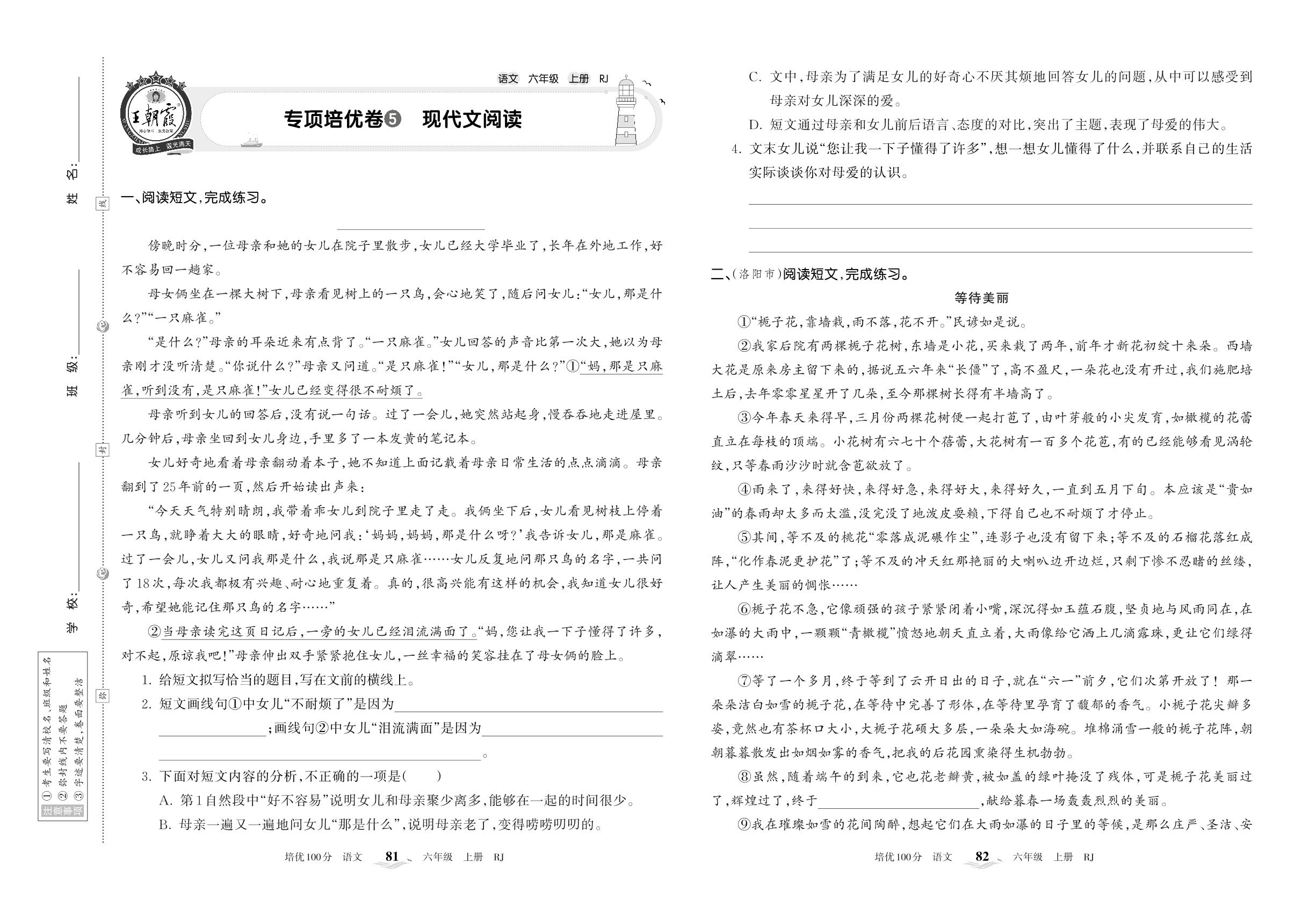 2022上册六年级语文人教版 专项培优卷5 现代文阅读