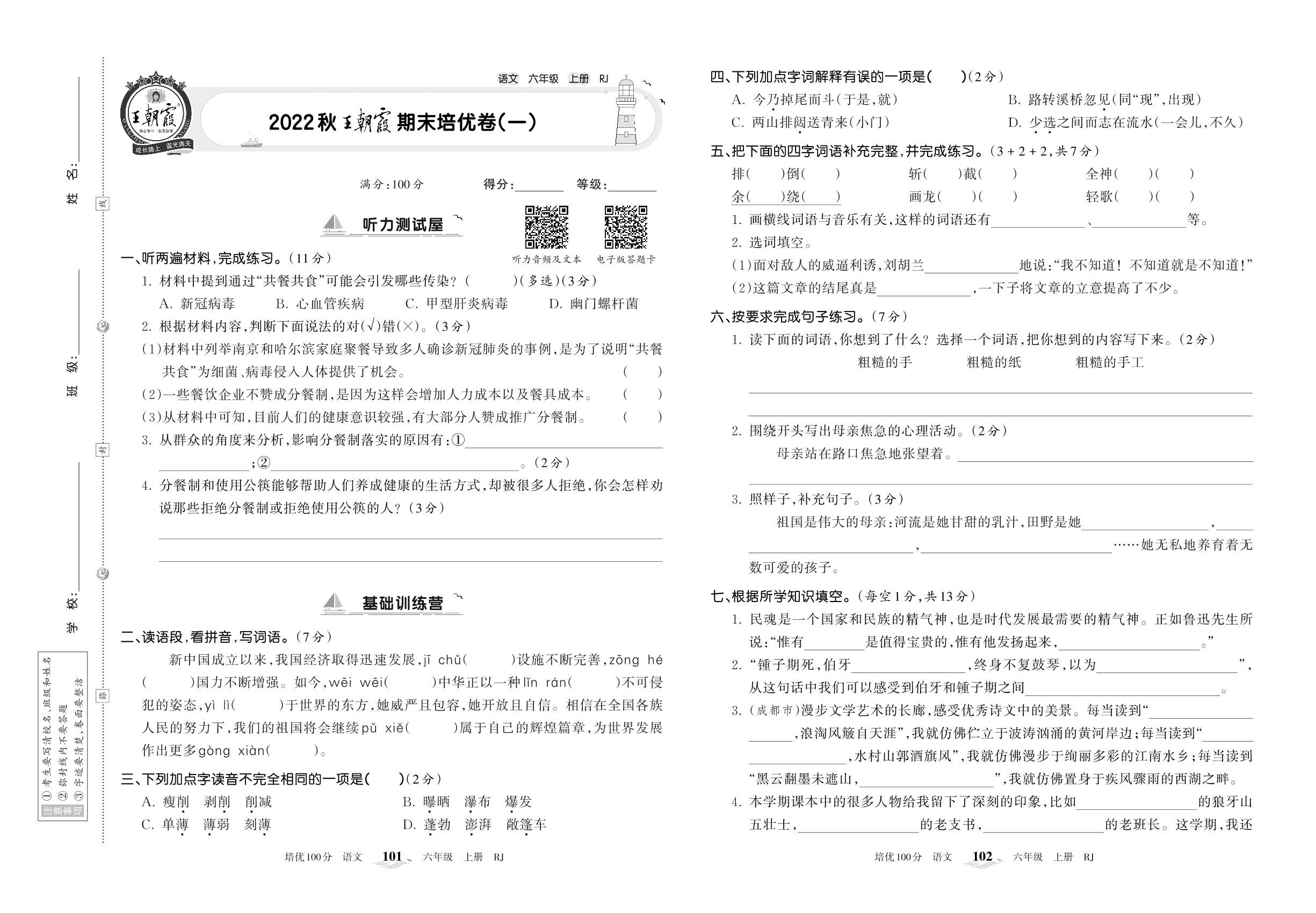 2022上册六年级语文人教版 2022秋王朝霞期末培优卷(一)