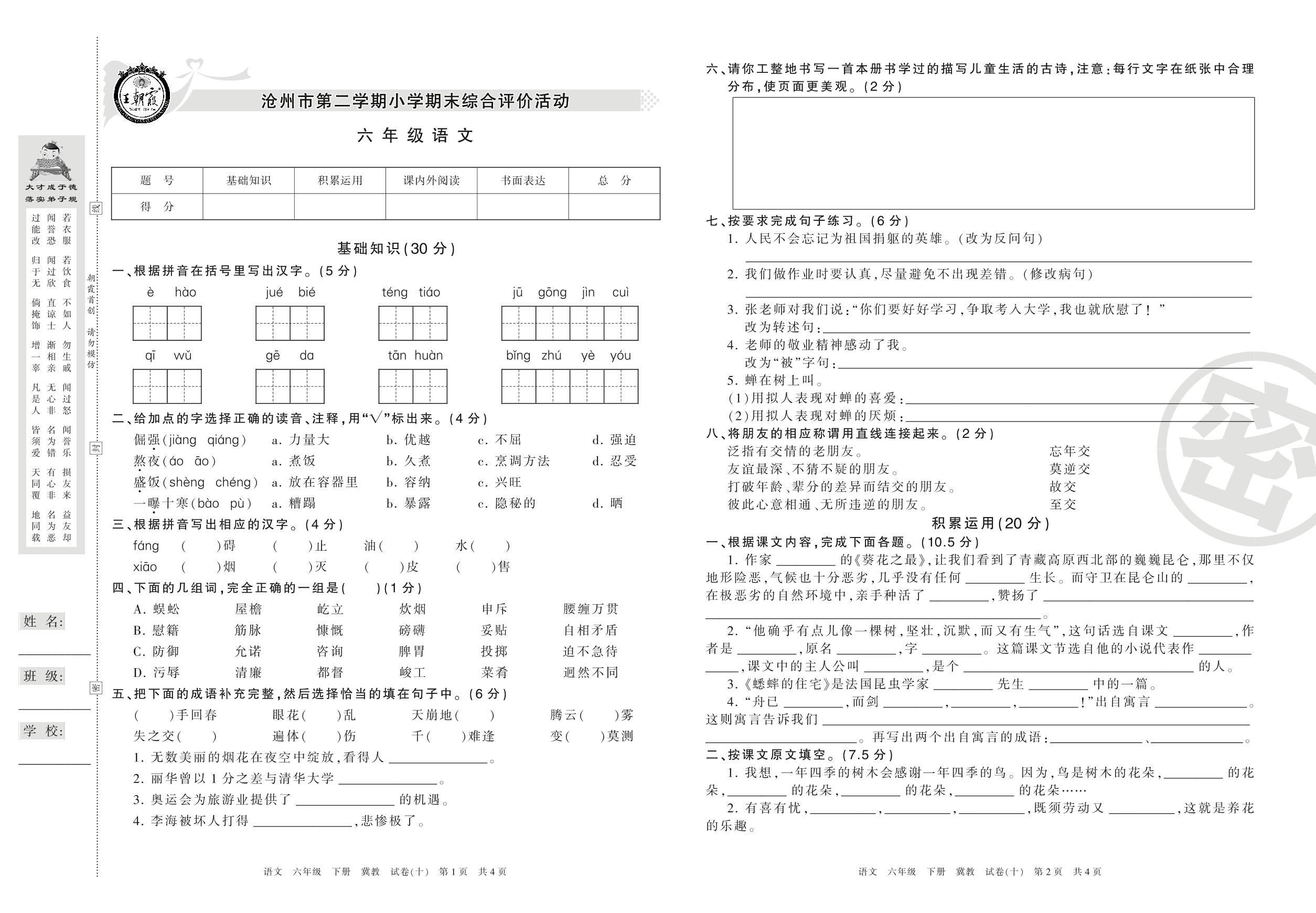 2015-2016学年第二学期沧州市六年级语文试卷(冀教版)【10】