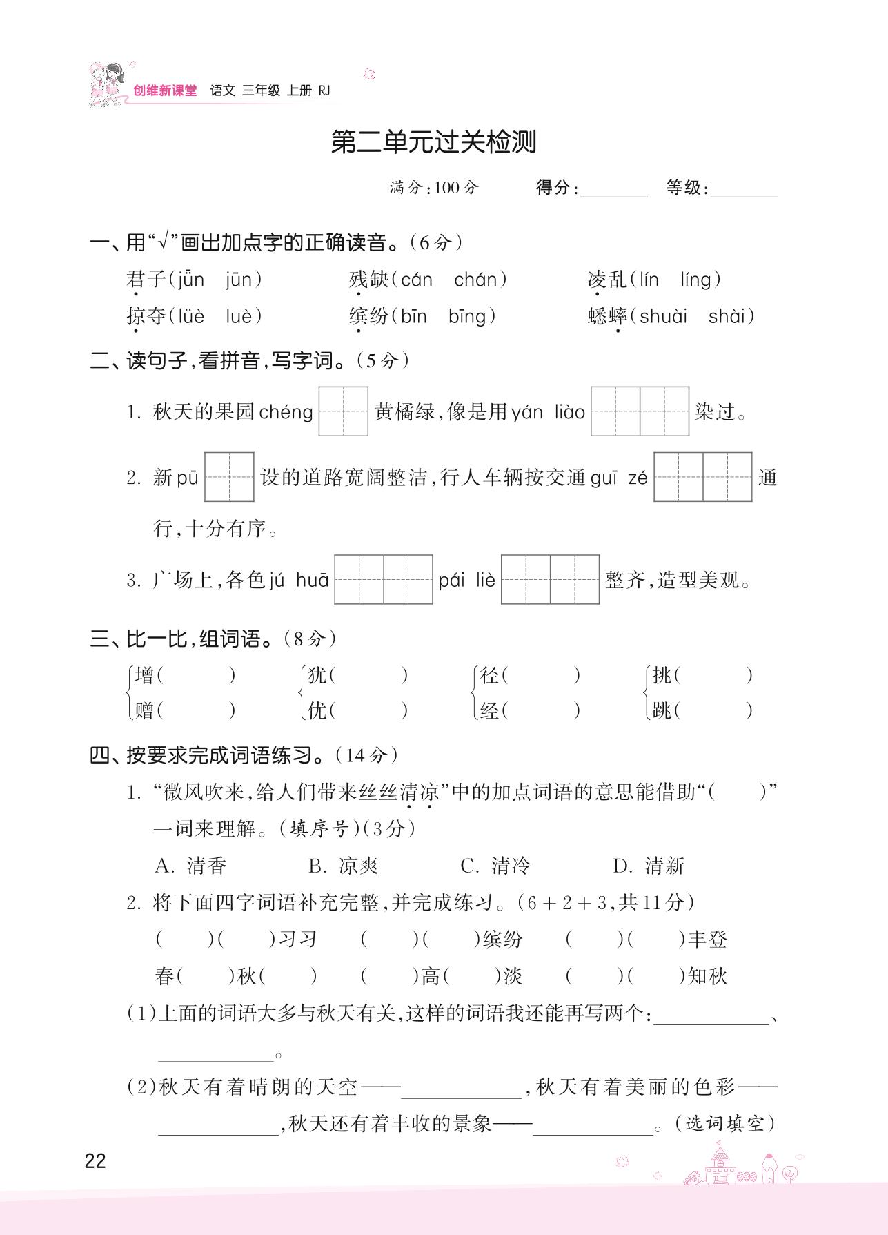 2022上册三年级语文人教版 第二单元过关检测