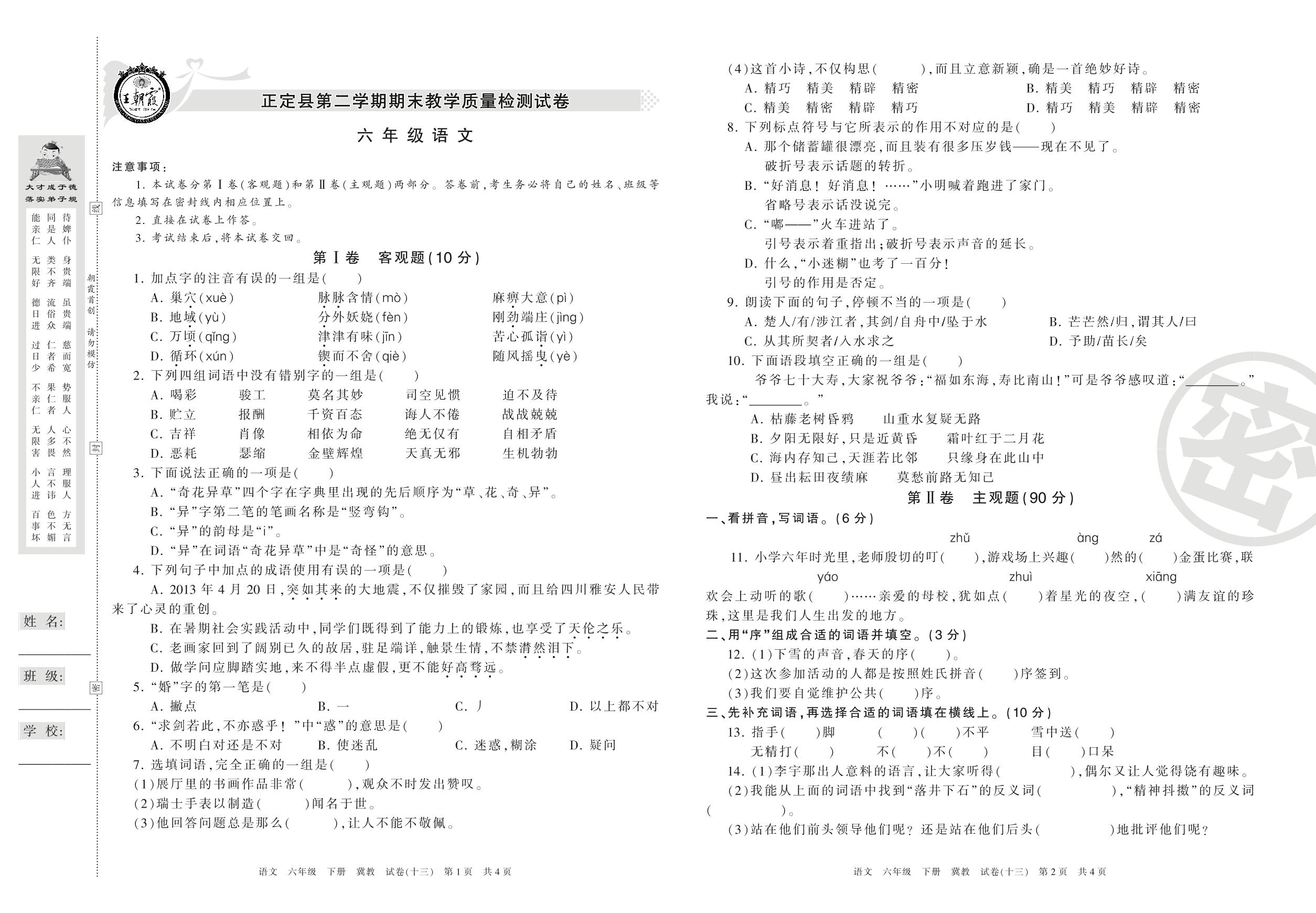 2015-2016学年第二学期石家庄市正定县六年级语文试卷(冀教版)【13】