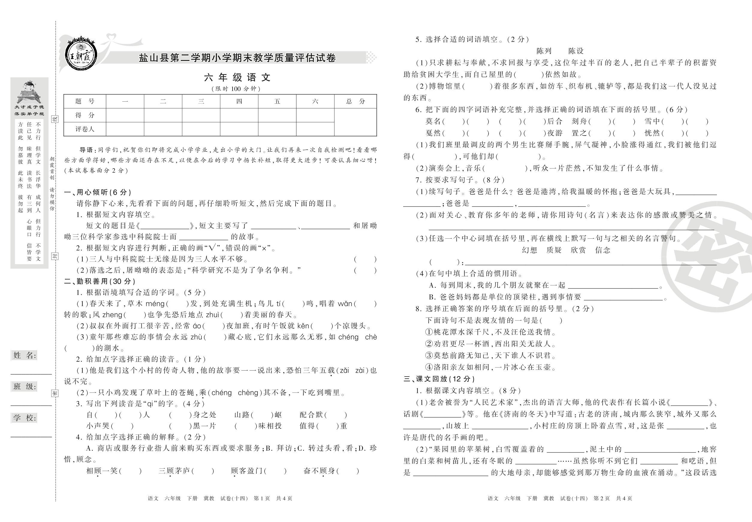 2015-2016学年第二学期沧州市盐山县六年级语文试卷(冀教版)【14】