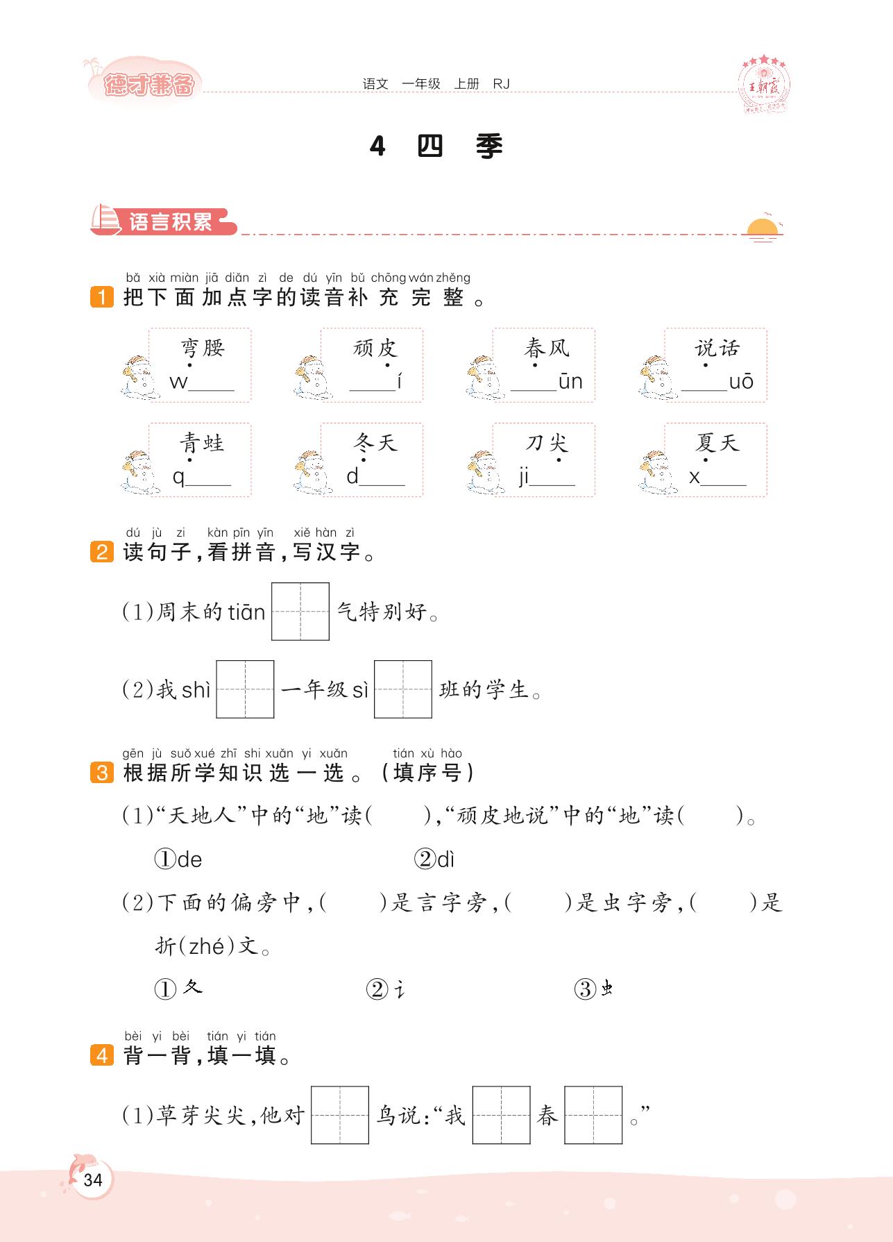 2022上册一年级语文人教版 第四单元 自然——4 四季