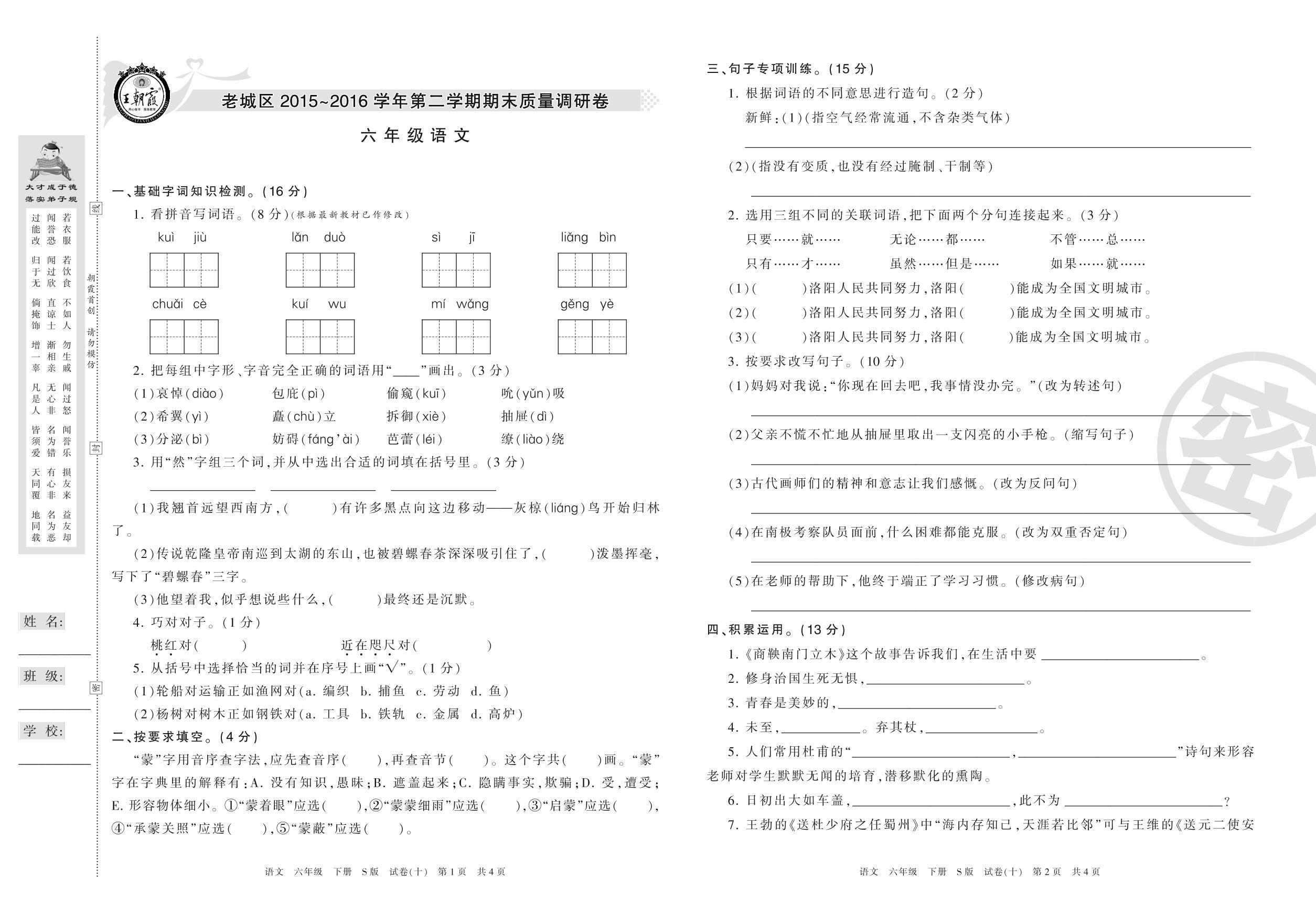 2015-2016学年第二学期洛阳市老城区六年级语文试卷(S版)【10】